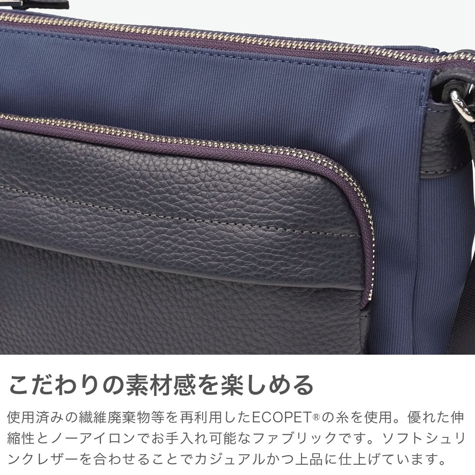 | 大人の毎日に寄り添う 洗練ミニショルダー 素材感のあるピケとシュリンクレザーを使用した、日本製カジュアルシリーズ「Pique/ピケ」のミニショルダー。スタイルを選ばないシンプルな色合いに、ファスナーテープカラーをポイントにしたデザインが特徴的です。撥水加工と防水性に優れた裏面処理によって、バッグに適した生地に加工。収納部はA5サイズに対応しており、休日の外出にぴったりなコンパクトフォルムです。ナイロン×レザーの異素材ミックスで、オンオフ問わずお使いいただけるアイテムになっています。 |