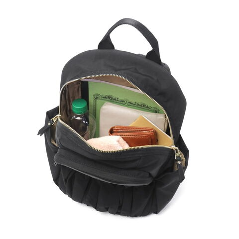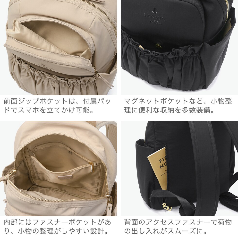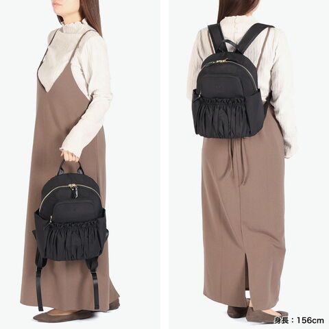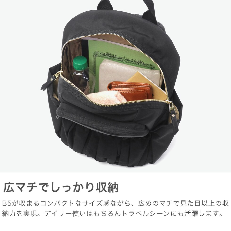 | ギャザーでつくる 優雅なシルエット フランス語で“優美さ”を意味する「グラシリィ」シリーズのリュック。軽やかでマットな素材にたっぷり寄せたギャザーを合わせ、ふんわりとしたシルエットと上品な雰囲気を演出します。前ポケットにはスマホを立てかけられる、うれしい機能付き。B5サイズ対応で、普段のおでかけや旅行にもぴったりです。 |