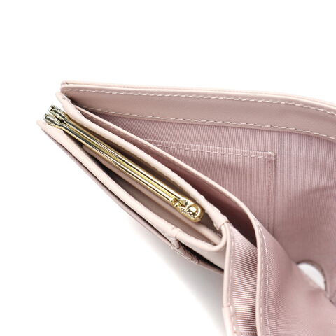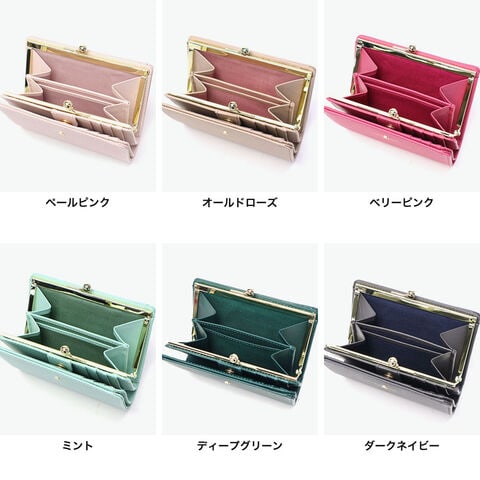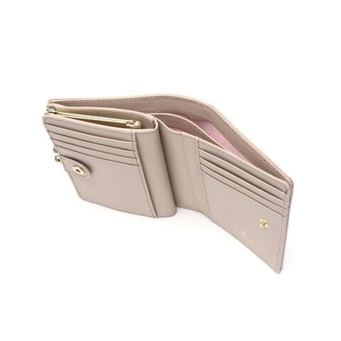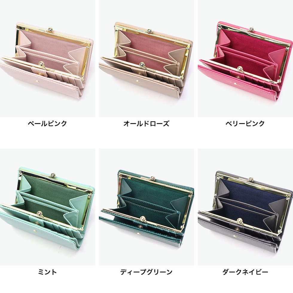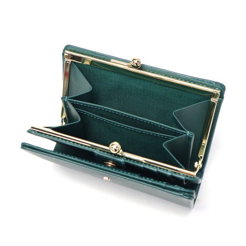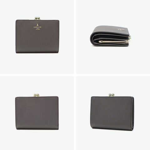 洗練された女性らしさを 高級感のあるゴールドのパーツが印象的なレザー二つ折り財布。口金タイプで小銭入れがしっかり開き、取り出しもスムーズ。品のある落ち着いたカラーで、手元に優しい雰囲気と彩りをプラス。ベーシックなデザインだからこそ、各パーツが美しく際立ちます。 |