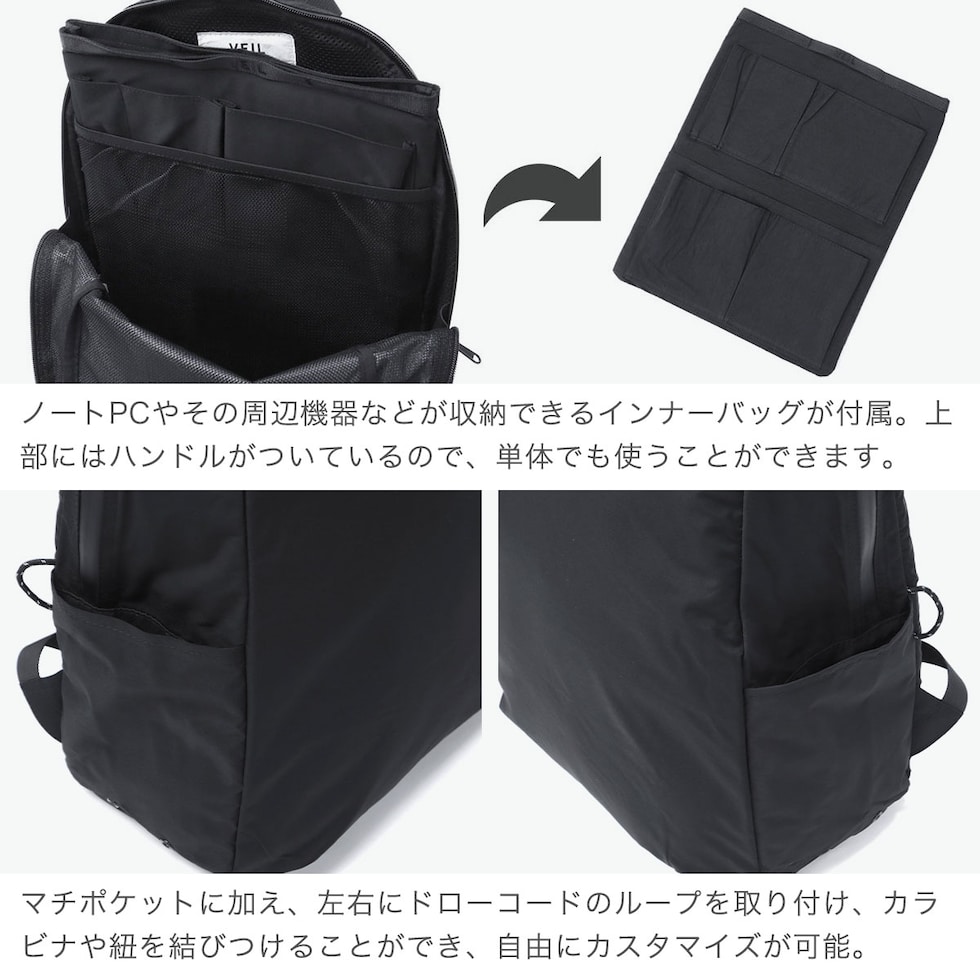 | 天候に左右されない自由 軽量で頼れるリュック 人気デザインユニット〈TENT〉と共同開発した『VEIL』は、「中身はそのまま、外側だけを着替える」という発想から生まれた機能的なバッグシリーズ。荷物を整理・保護するインナーバッグ(PCケース)と、シーンに応じて選べるアウターバッグを組み合わせ、柔軟な使い分けを実現します。本モデルは、防水仕様のアウター(リュック)とインナーバッグのセット。20Lの容量を備えつつ軽量設計で、日常使いにも最適です。外装には防水性・透湿性・耐久性に優れた3レイヤー構造のナイロン素材を採用し、雨天でも快適に使用できます。 |