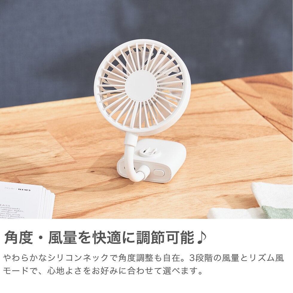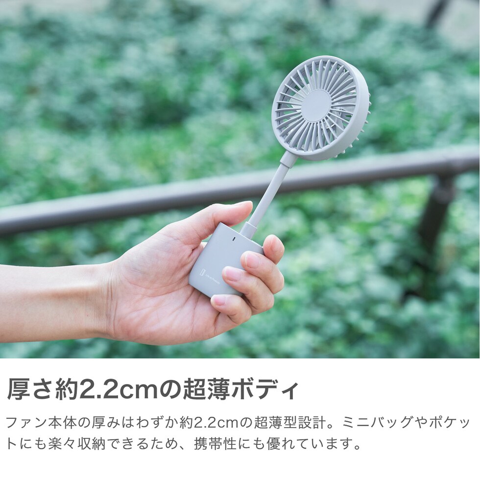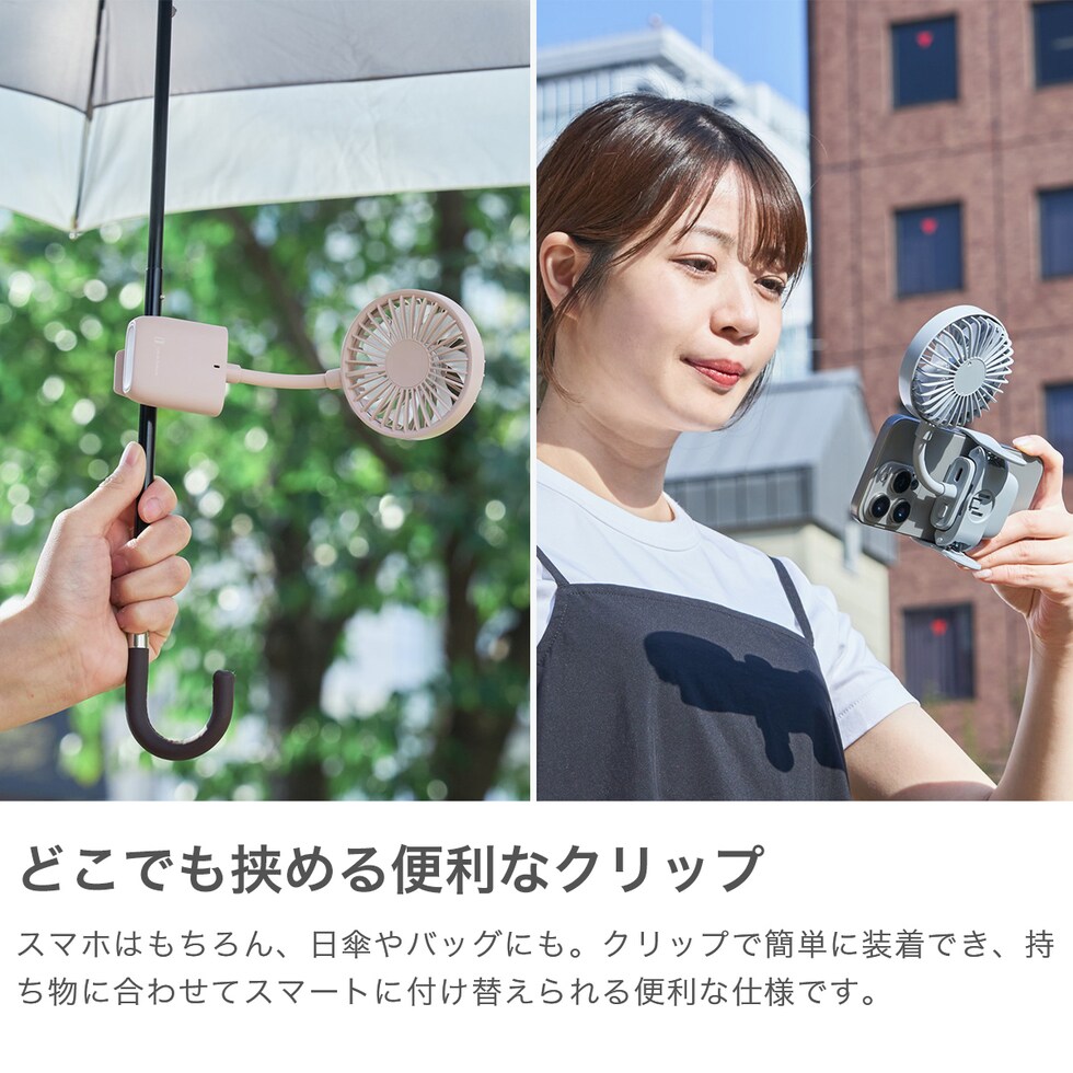 | 手軽にクリップ 風を携帯して スマホや日傘にも取り付け可能な薄型クリップファン。片手でスマホを操作しながら、もう片方で荷物を持つことができるので、外出時に便利です。約2.2cmの超薄型設計で携帯にもぴったり。クリップで日傘やバッグに取り付けられ、風量3段階調整可能。フレキシブルなシリコン製の角度調節で、どこでも涼しさを届けてくれます |