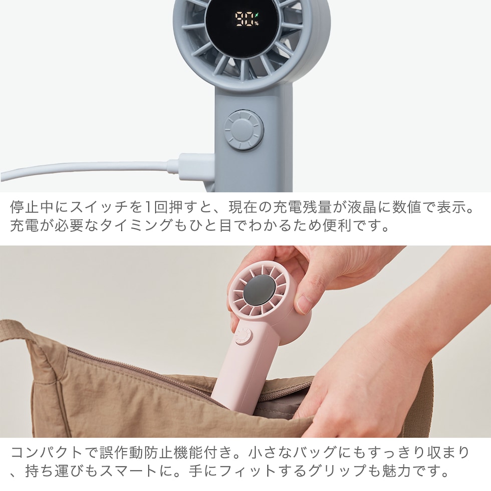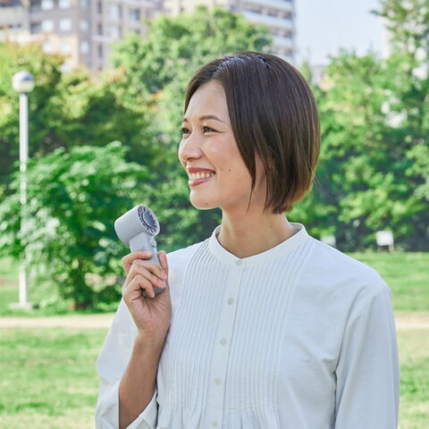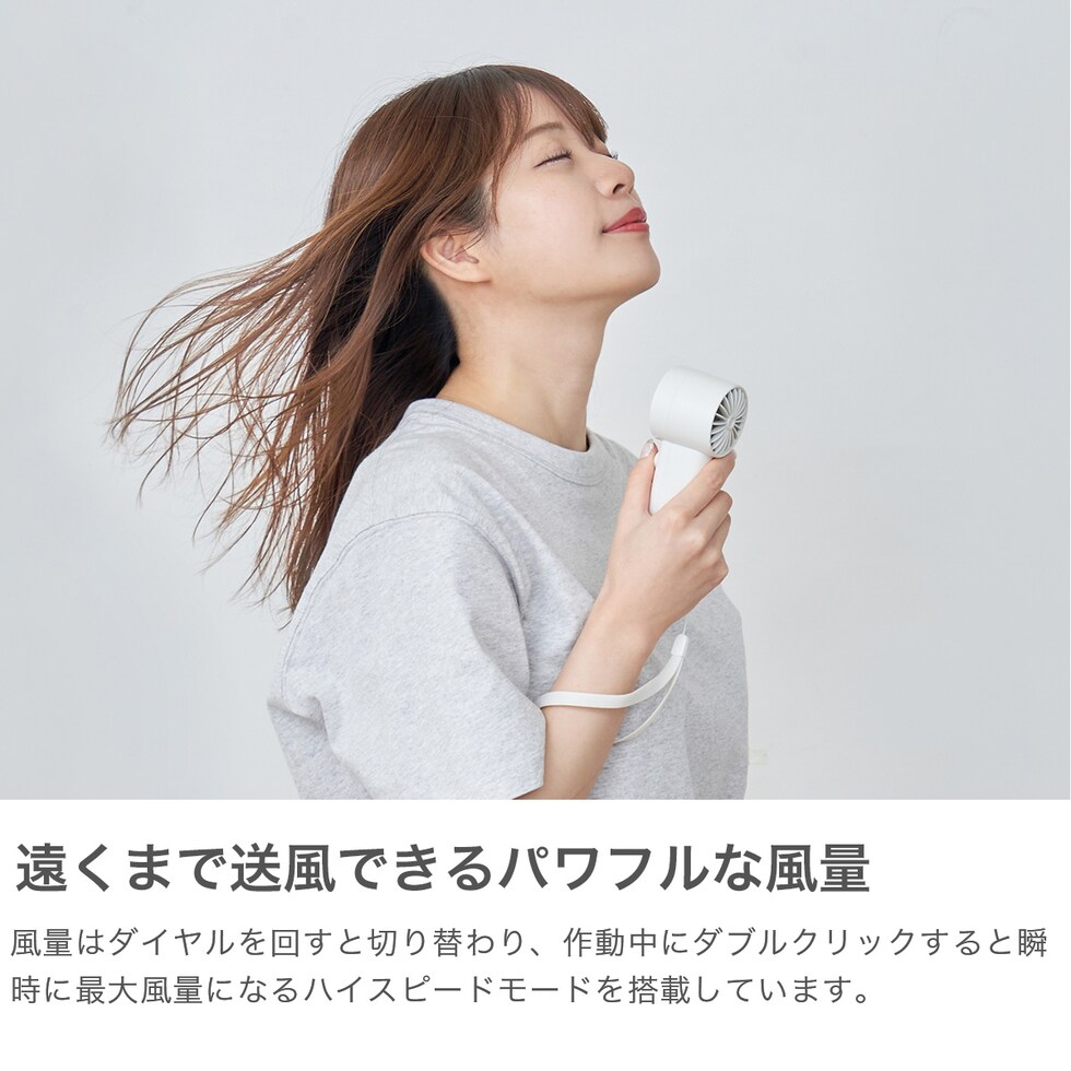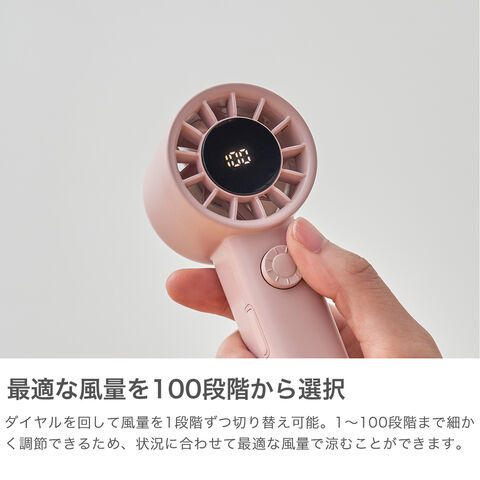 スリム&コンパクトな手のひらサイズに、100段階の風量調節機能を搭載したパワフルなターボファン。ダイヤル操作で細やかな風量調整が可能で、瞬時に強風に切り替わるモードも便利。液晶表示で風量・バッテリー残量も一目で確認できます。外出先や通勤・通学にも頼れる1台です。