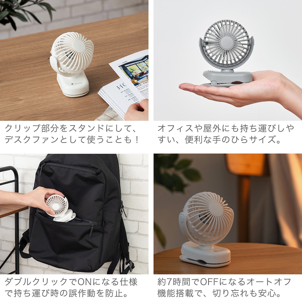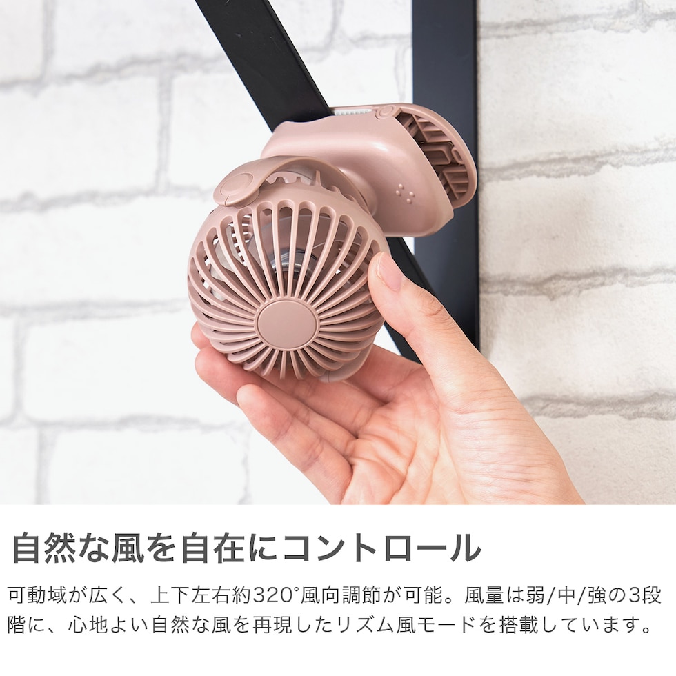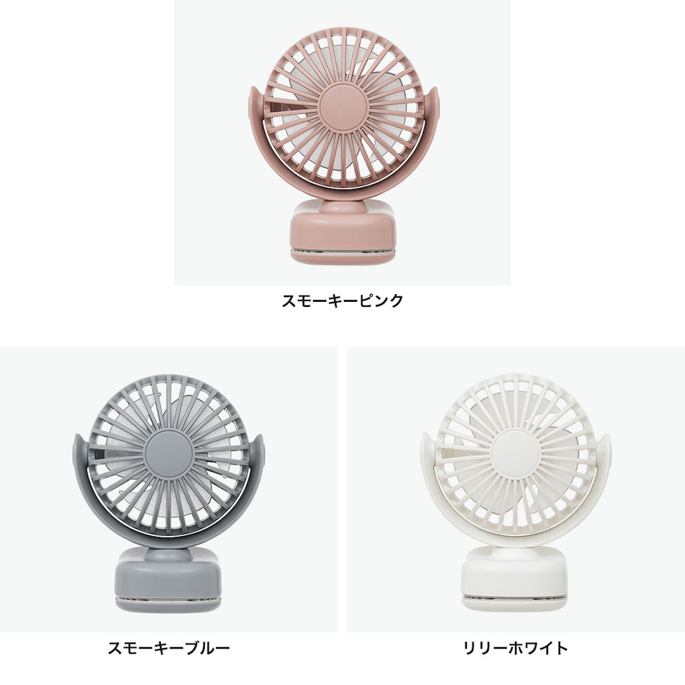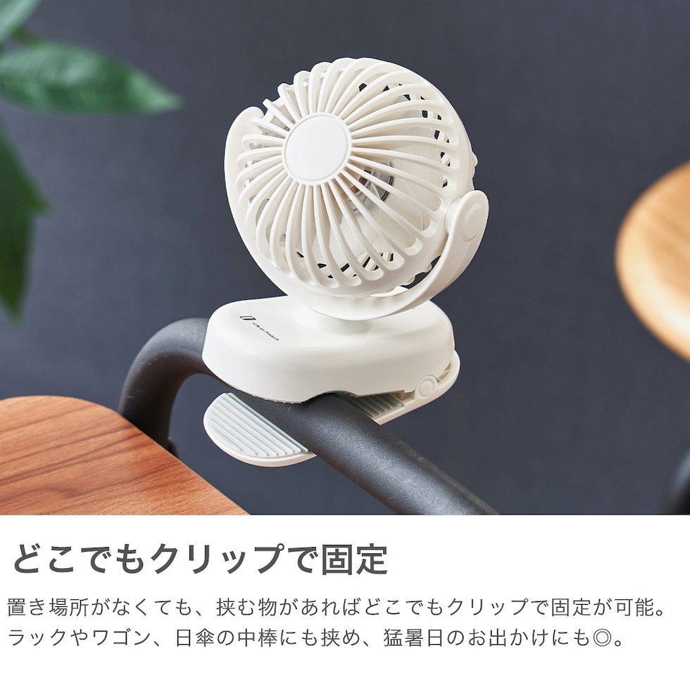 | 小さいのにパワフル! クリップ式ミニファン クリップ式で卓上・傘・ベビーカーなど多用途に使える充電式ミニファン。風量3段階&風向調節機能で快適な風をお届け。USB充電&コードレスで持ち運びもスマートな便利アイテムです。 |