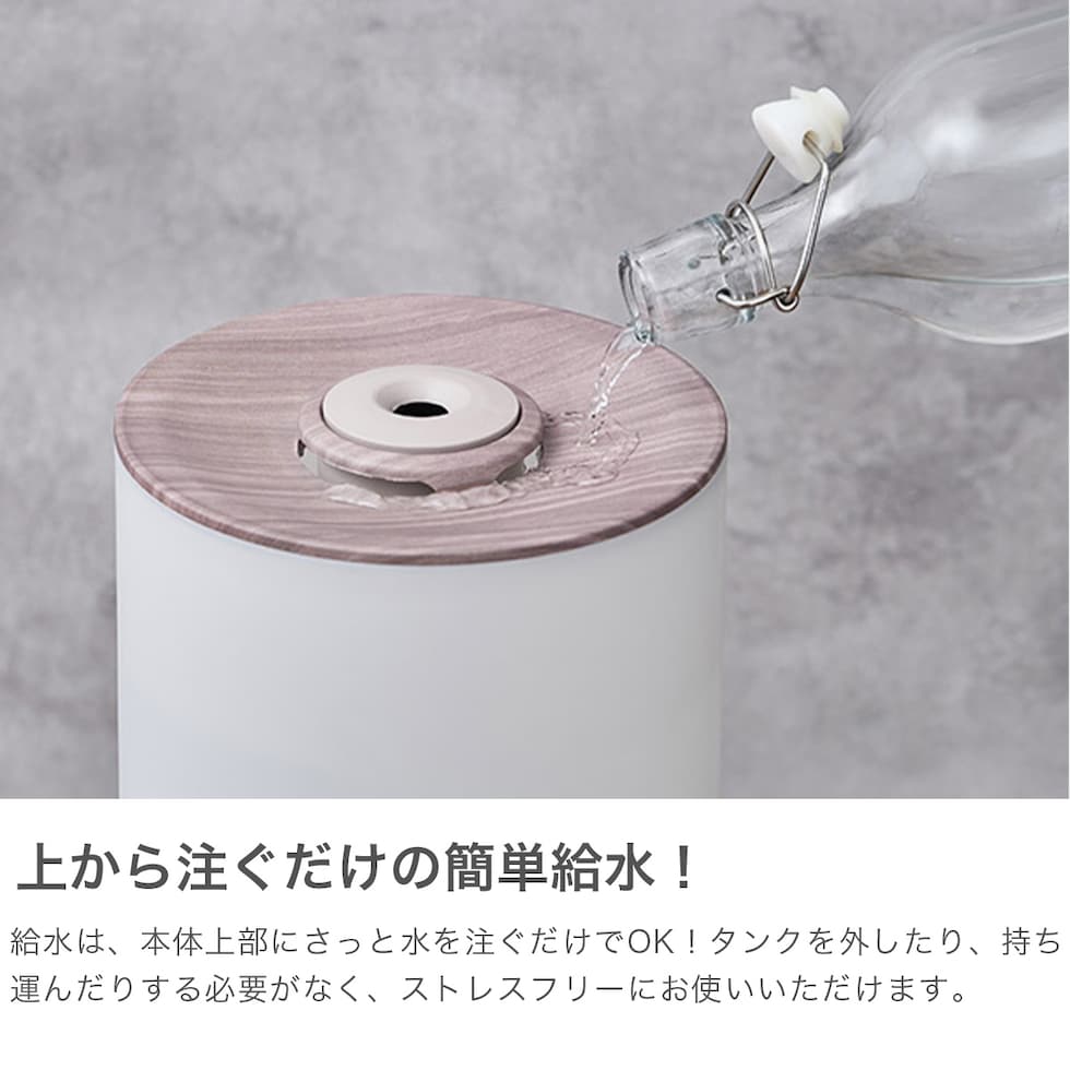 上部給水式、ミスト量2段階調節、LEDライトのON/OFF