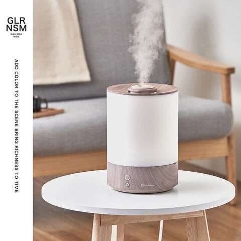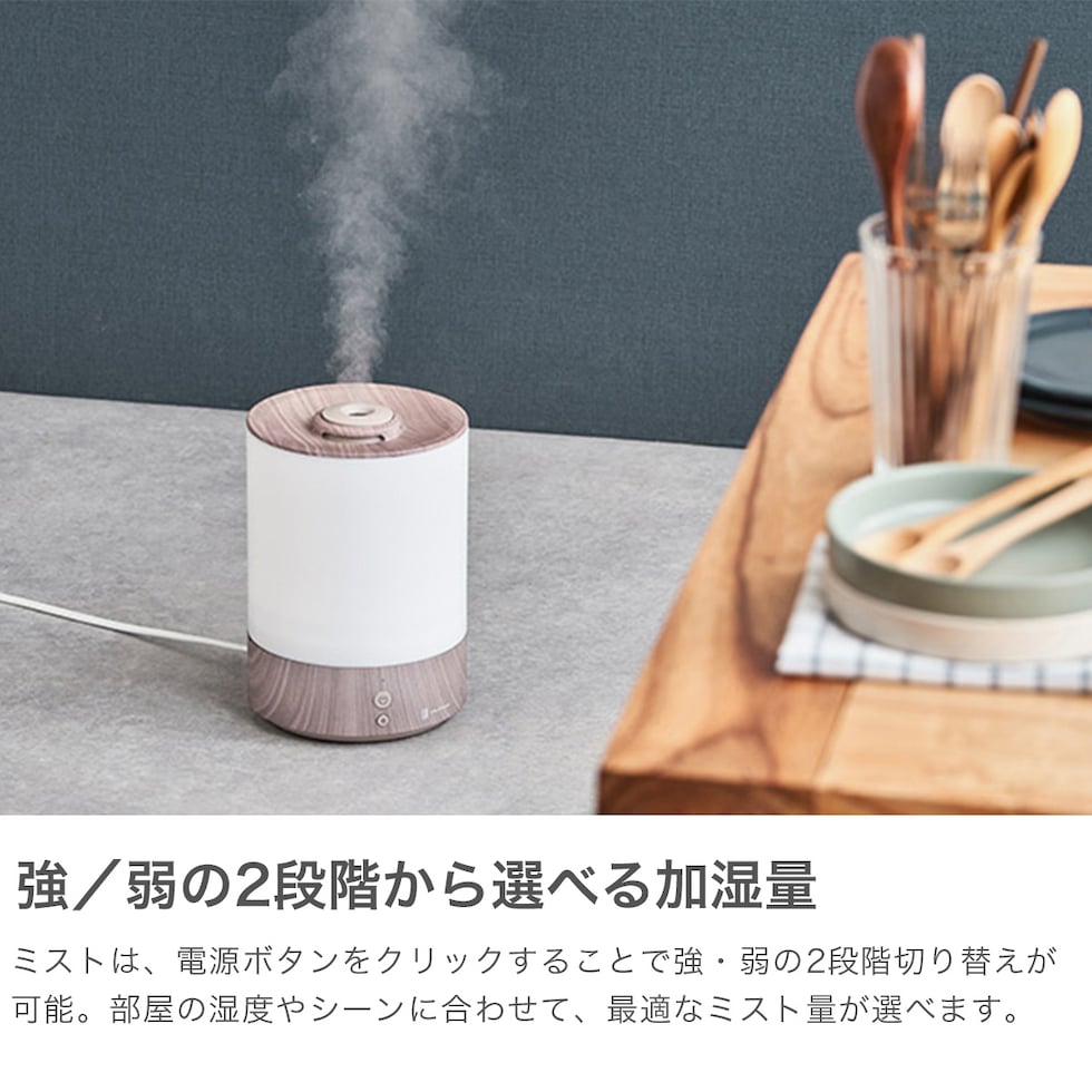 高精細な意匠表現技術をもつ大日本印刷株式会社との協業による、美しい木目柄をあしらった加湿器。インテリアに調和する上、関節照明としても使えるLEDライト機能も搭載。ミストは強弱を調節でき、部屋の湿度やシーンに合わせた、最適なミスト量をお選びいただけます。