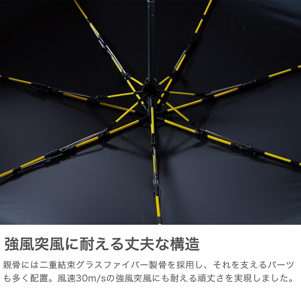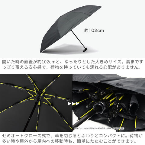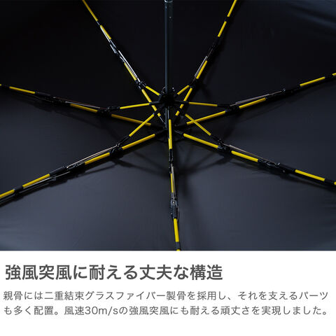 機能的折りたたみ傘 強風や突風に強いタフな構造に加え、快適な水切れが続く耐久撥水加工と雨の浸透を防ぐ高耐水加工により、強い雨に対応する豪雨モデルの折りたたみ傘です。荷物も濡れにくい親骨60cmの大きめサイズで、体をしっかりカバーします。UVカット90%以上で晴れの日にも対応。シンプルなデザインで、毎日の通勤・通学に活躍します。 |