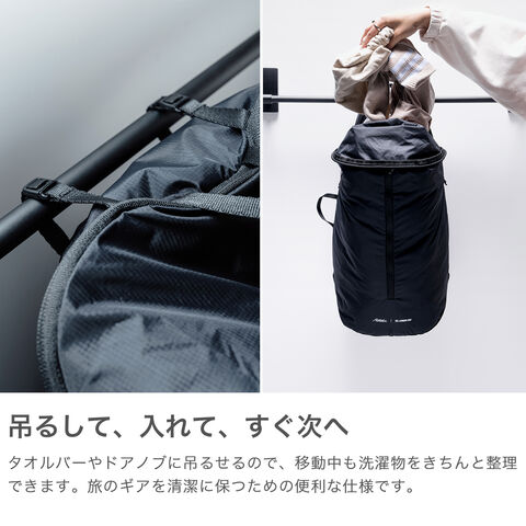 | 小さく持ち運べて大容量 機能美ランドリーバッグ 汚れた衣類を最大30Lまで収納できる大容量のランドリーバッグ。超軽量のパッカブル仕様で、使わない時はコンパクトに携帯できます。上部と前面のジッパーアクセスにより、吊るしても平置きでも使いやすい設計。防水生地が汚れ物をしっかり分離し、複数のハンドルで持ち運びや出し入れも快適です。長期旅行や出張で活躍する、頼れるアイテムです。 |