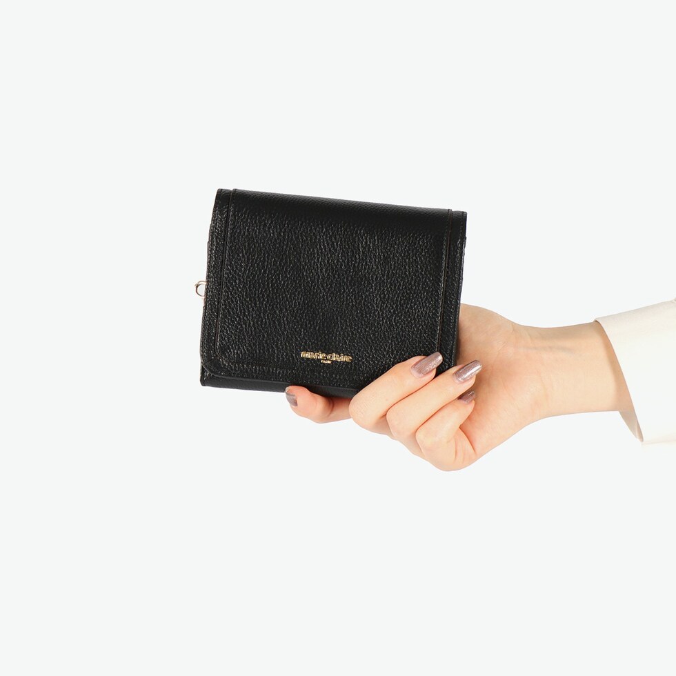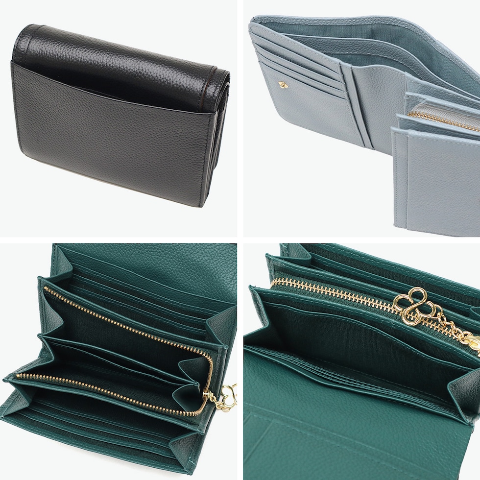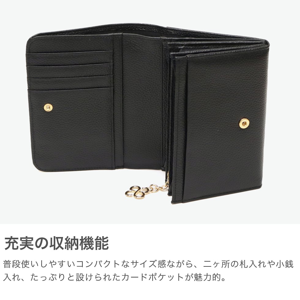 | 品よく華やぐ レザーウォレット 牛革にシュリンク型押し加工を施した傷や汚れが目立たず、柔らかく上質な手触りが魅力の『Carrousel』シリーズの二つ折り財布です。シンプルなデザインに、ゴールドのロゴと、ブランドアイコンでもあるクローバーのチャームが華やかさを添えます。カードや小銭もしっかり収まり、普段使いしやすいサイズ感です。実用性とデザイン性を兼ね備えた、大人の女性にぴったりのアイテムです。 |