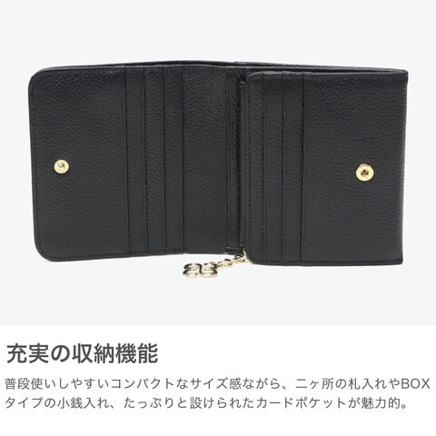 | 上質な使いやすさが魅力 大人のレザーウォレット 牛革にシュリンク型押し加工を施した傷や汚れが目立たず、柔らかく上質な手触りが魅力の『Carrousel』シリーズの二つ折り財布です。シンプルなデザインに、ゴールドのロゴと、ブランドアイコンでもあるクローバーのチャームが華やかさを添えます。ボックス型の小銭入れは、大きく開いて中身が見やすく取り出しもスムーズ。実用性とデザイン性を兼ね備えた、大人の女性にぴったりのアイテムです。 |
