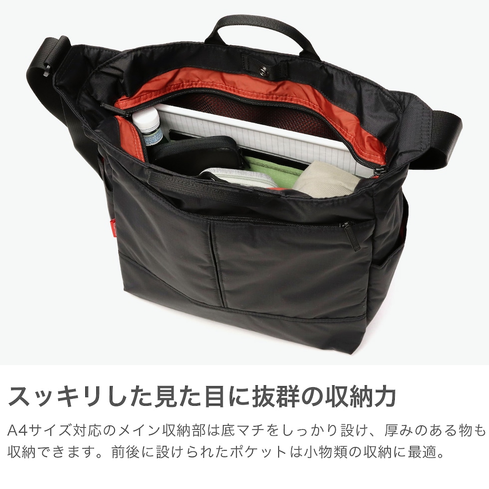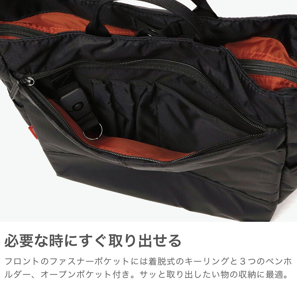 | デイリー使いに優れた 機能性と実用性 MANHATTAN PASSAGEのスタイリッシュショルダー「Commuter」は、軽量で14Lの大容量を実現した毎日使いたくなる仕上がり。持つ人を選ばないシンプルな装いにA4サイズ対応の実用性のあるサイズ感となっており、オンオフ関わらずお使いいただけます。 |