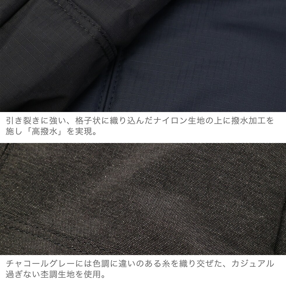 | 素材 | 高密度リップストップナイロン:ブラック、ミッドナイトブルー ナイロン、ポリエステル:チャコールグレー |
