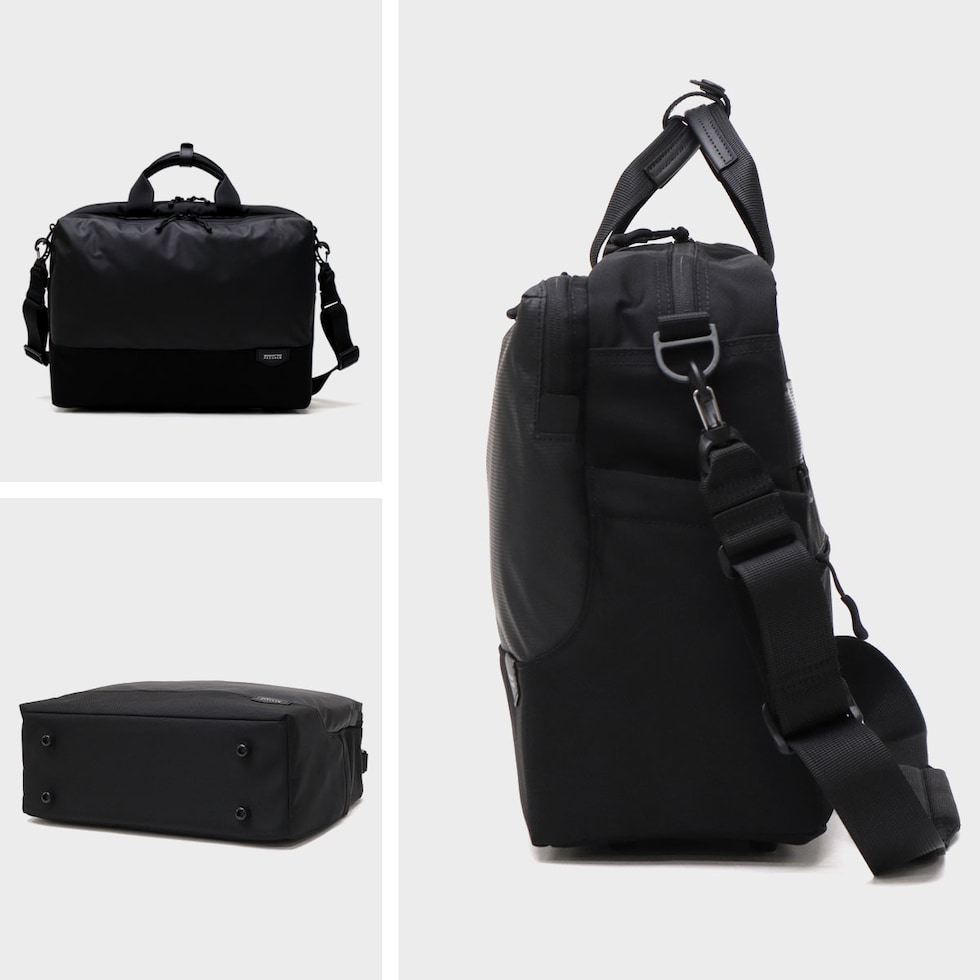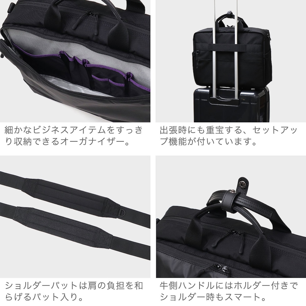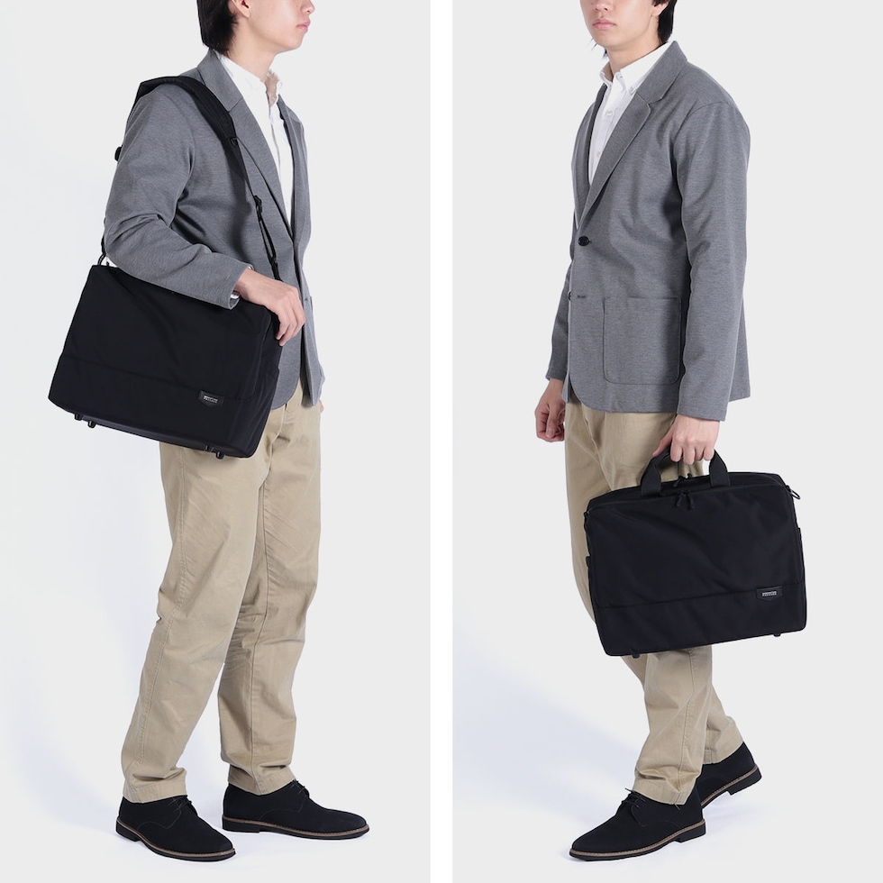 | 軽量&大容量の ハイスペックブリーフ 大容量かつ軽量で、毎日の通勤を快適にする2WAYブリーフケース。広々とした底マチを設けたメインルーム、ビジネス小物の管理に役立つオーガナイザー、移動時にもすぐに手が届く外側サイドポケットなど、使いやすさを追求した豊富なポケットを装備しています。着脱可能なショルダーストラップや、キャリーケースとのセットアップベルトを設け、どんな移動シーンでもストレスフリーに携帯できるのも魅力です。 |