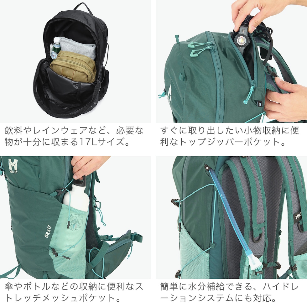 【正規品2年保証】 ミレー リュック メンズ レディース 大容量 MILLET カジュアル バッグ ブランド A4 軽量 おしゃれ 軽い ハイキング 登山 旅行 アウトドア ナイロン バックパック 撥水 はっ水 17L GRX MIS01304