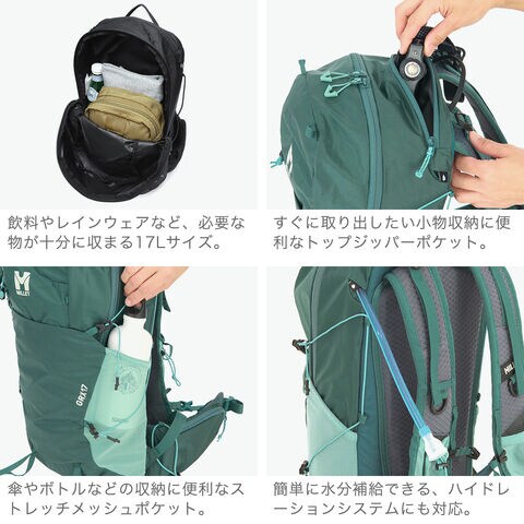 デイリー使いも◎ 軽量&撥水素材で日帰りハイクや旅行に最適なMILLETの17Lリュック。ペットボトルや山専地図対応の拡張式ポケットやホイッスルなど、便利機能も満載。抜群の収納力で街でもアウトドアでも活躍します。 |
