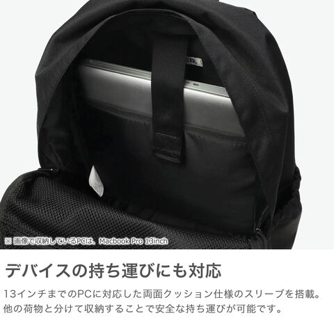 シンプルデイパック いつでもどこへでも、通勤通学のデイリー使いから旅行までライフスタイルに合わせて選べる『DAILY』シリーズ。こちらは、A4サイズのファイルも収まる実用的なデイパックです。外側にはサイドに1つずつと正面に1つ大きめのポケットがあり、タンブラーや傘などが収納できてとても便利。さらに背面側にも隠しポケットを備えています。フロントのロゴ部分と付属のキーホルダーはリフレクター仕様になっているので、暗い夜道でも安心です! |