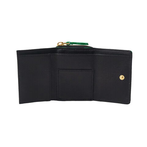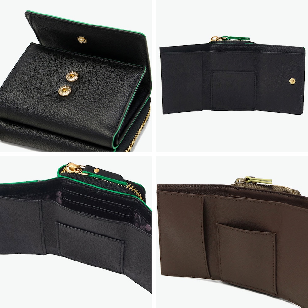 かわいい三つ折り財布 コバの配色とチェリーグラフィックの裏地がポイントのコンパクトウォレット。高級感のある柔らかなレザーに、コバのアクセントカラーが映えるおしゃれなデザイン。小さめながら収納力があり、使いやすさも抜群。使うほどに魅力が増していく育てる楽しさもポイントです! |