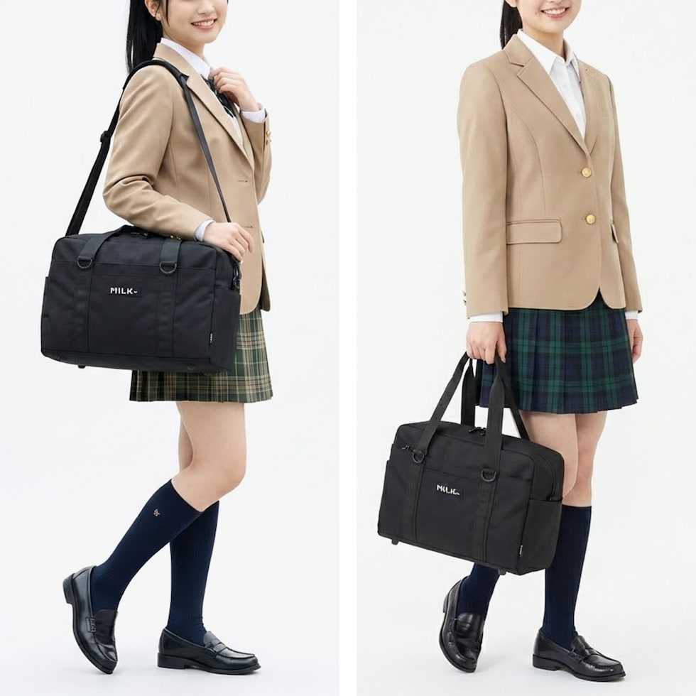 | 学生カバンのような レトロ可愛いルックス トレンドのY2Kや古着系、制服スタイルにも映えるスクールライクなボストンバッグ。学生カバンのようなレトロな可愛さで、スクールバッグとしてもおすすめです。見た目以上の収納力に加え、ショルダーストラップ付きの2WAY仕様や小物を仕分けやすい豊富なポケットなど、機能性も◎。Dカンにキーホルダーやチャームをつければ、自分だけのカスタマイズも楽しめます♪通学から旅行まで、毎日をハッピーに彩るアイテムです。 |