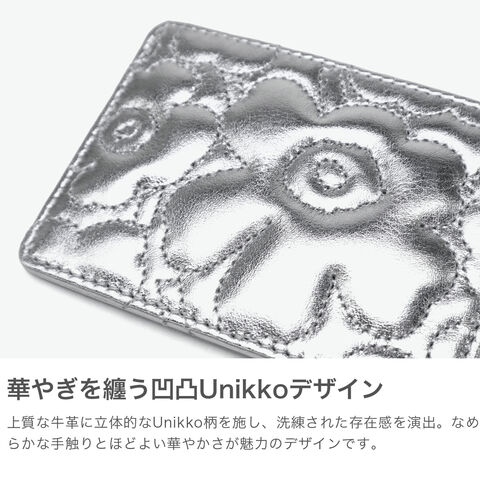 印象的なUnikko柄 凹凸のある"Unikko柄"がでデザインされたエレガントなカードケース。手触りの良いレザー仕様でコンパクトにカード類を持ち歩きたい方にぴったりです。持つだけで華やぐような柄とカラーリングで、プレゼントにもおすすめのアイテムに仕上がっています。 |