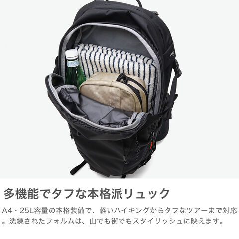 | ハイスペックな アウトドアリュック 山の頼もしいパートナーとして充分な機能を備えた25L容量のバックパック。本体は、軽く通気性に優れたメッシュ素材の背面パットで快適な背負い心地が特徴です。コンパクトな設計で、ハイキングや登山・トレッキングなどを快適にする機能的なアイテムに仕上がっています。 |