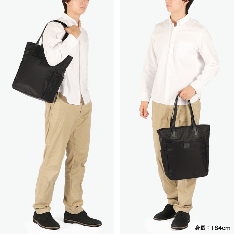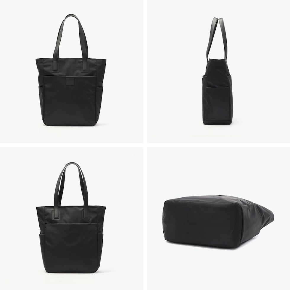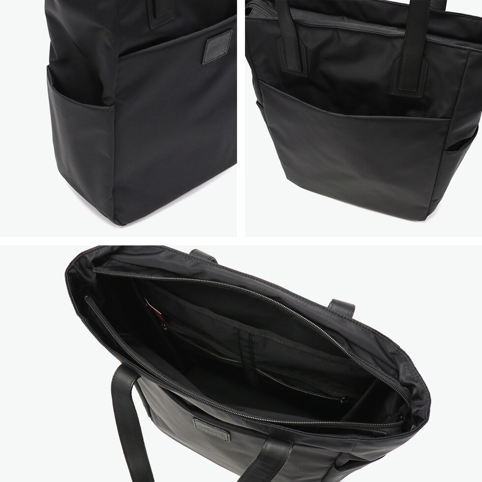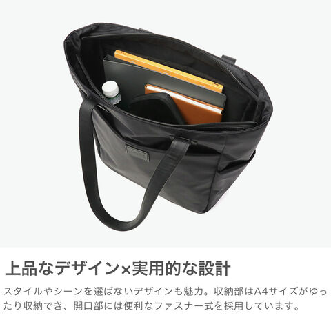 シックなレザーで引締め さらりとした光沢感のあるツイル生地にレザーの持ち手をプラスし、落ち着いた高級感のあるデザインに仕上げたトートバッグ。ポケットを多数設けた実用的な設計です。開口部はファスナー付きで、ビジネスシーンにも安心。シンプルな外装に、ロゴが刻印されたレザーパッチがさりげないアクセントとなって上品さを引き立てています。 |