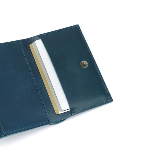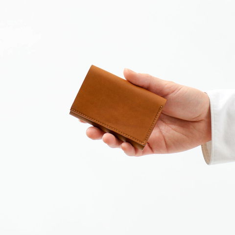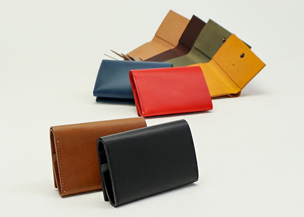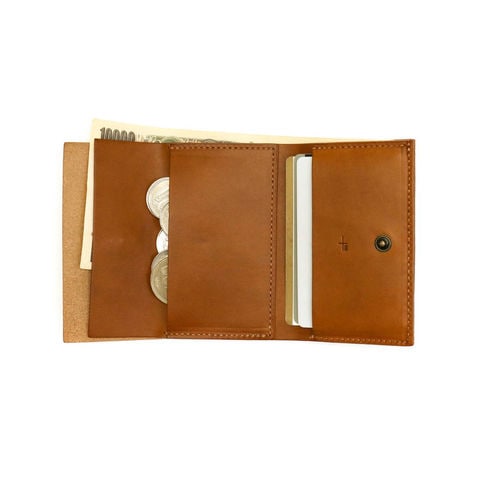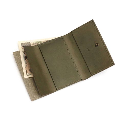 できるだけ余分な部品や機能を足さず、革に包んでホックを留めるだけで成立させることを目指したコンパクトな三つ折り財布。「財布」的にならないデザインが本体をより小さく感じさせ、身軽な仕上がりに。ポケットや小さなバッグにもしまいやすいスマートなアイテムです。