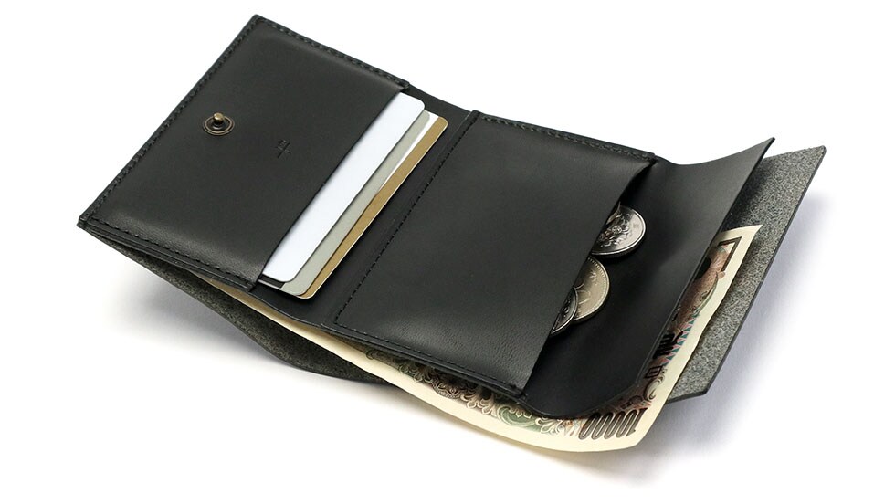 収納部はコンパクトながら、お札10枚、100円玉15枚、厚めのカード5枚程度が入るように作られています。札入れは折らずにそのまま入れられる形式をとり、出し入れがスムーズな点も魅力です。