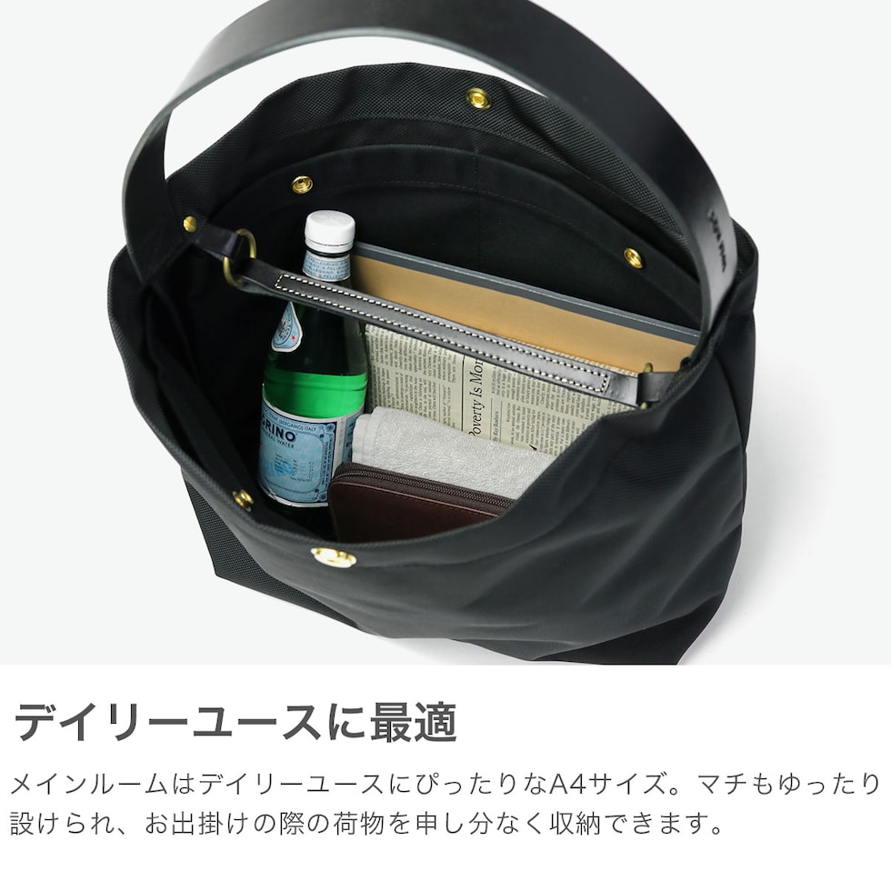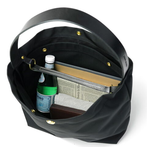 ナイロントートバッグ 軽さと耐久性を兼ね備えた、こだわりを感じるナイロン生地のトートバッグ。外出時に必要な物が余裕をもって収納できるサイズ感で、デイリーに活躍します。2本のレザーハンドルを備えることで、使いやすさにも配慮しつつさりげない上質感をプラス。日常のさまざまなコーディネートに自然と溶け込む、シンプルで上品なデザインに仕上がっています。 |