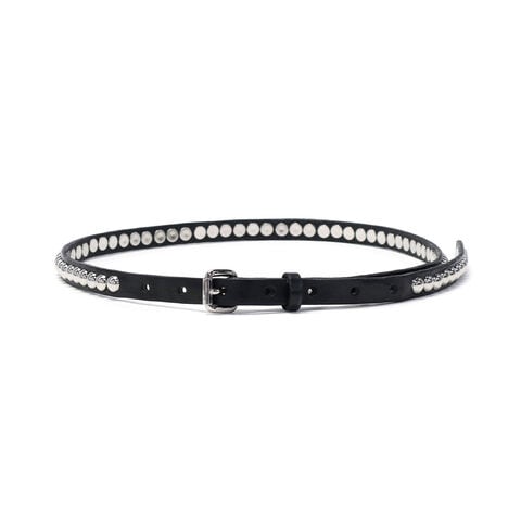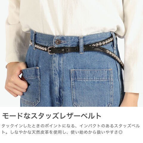 大人の黒ベルト 華奢なシルエットにスタッズが輝く本革レザーベルト。ユニセックスで楽しめる細身デザインが、カジュアルからモードまで幅広く対応。日本製の上質な牛革が、大人の装いにさりげないスパイスを添えます。 |