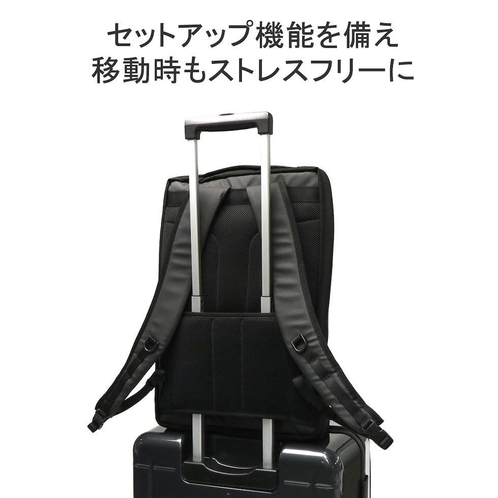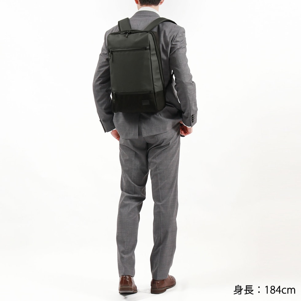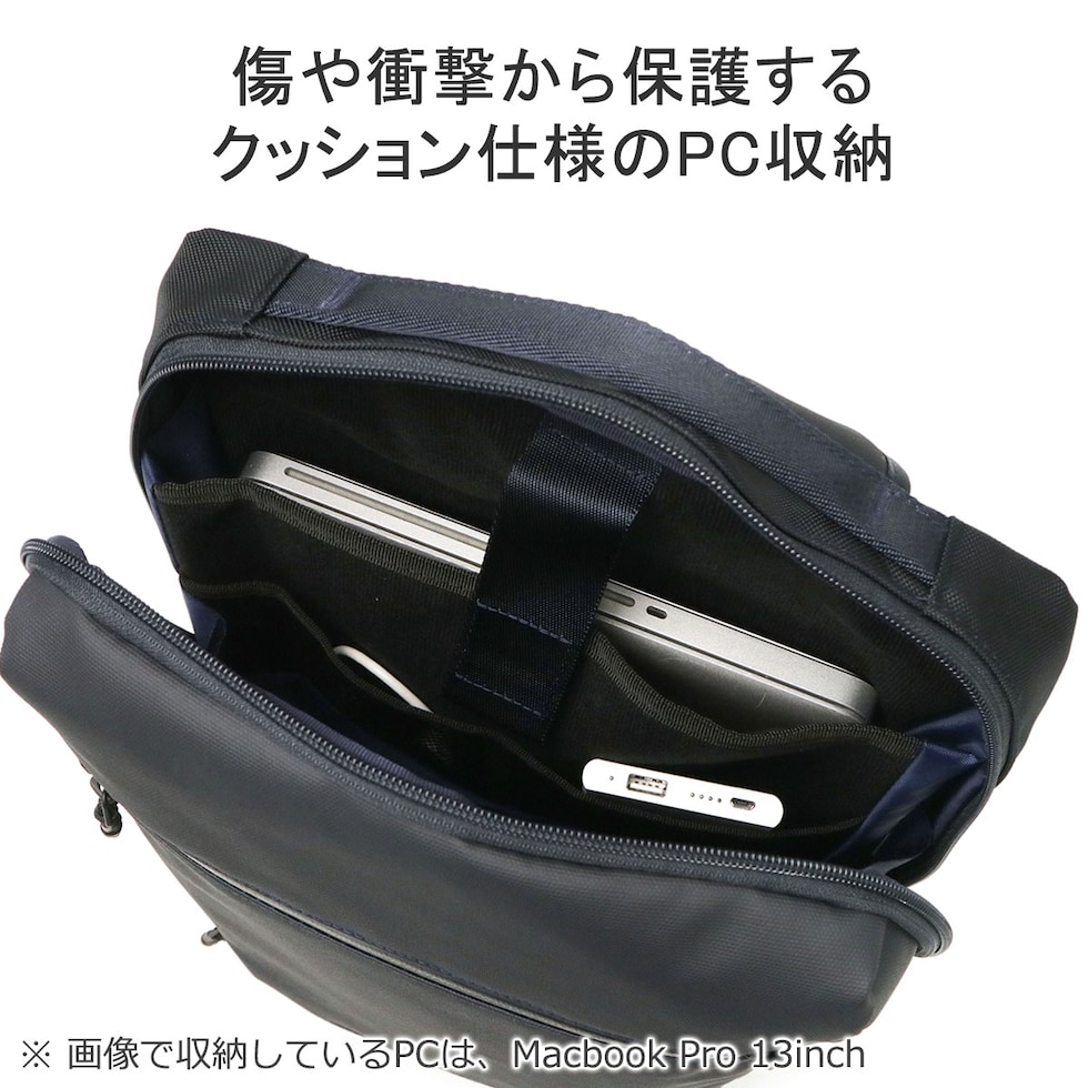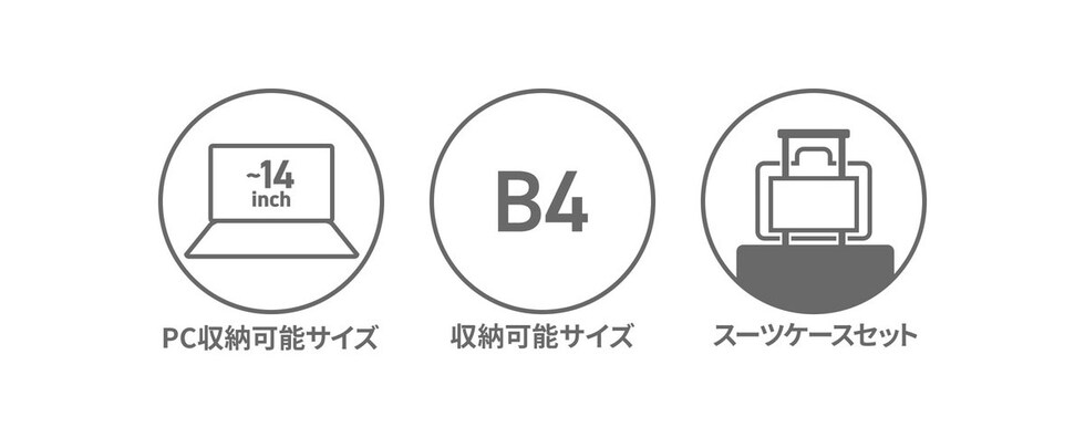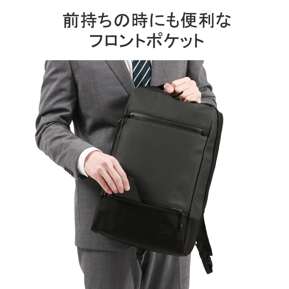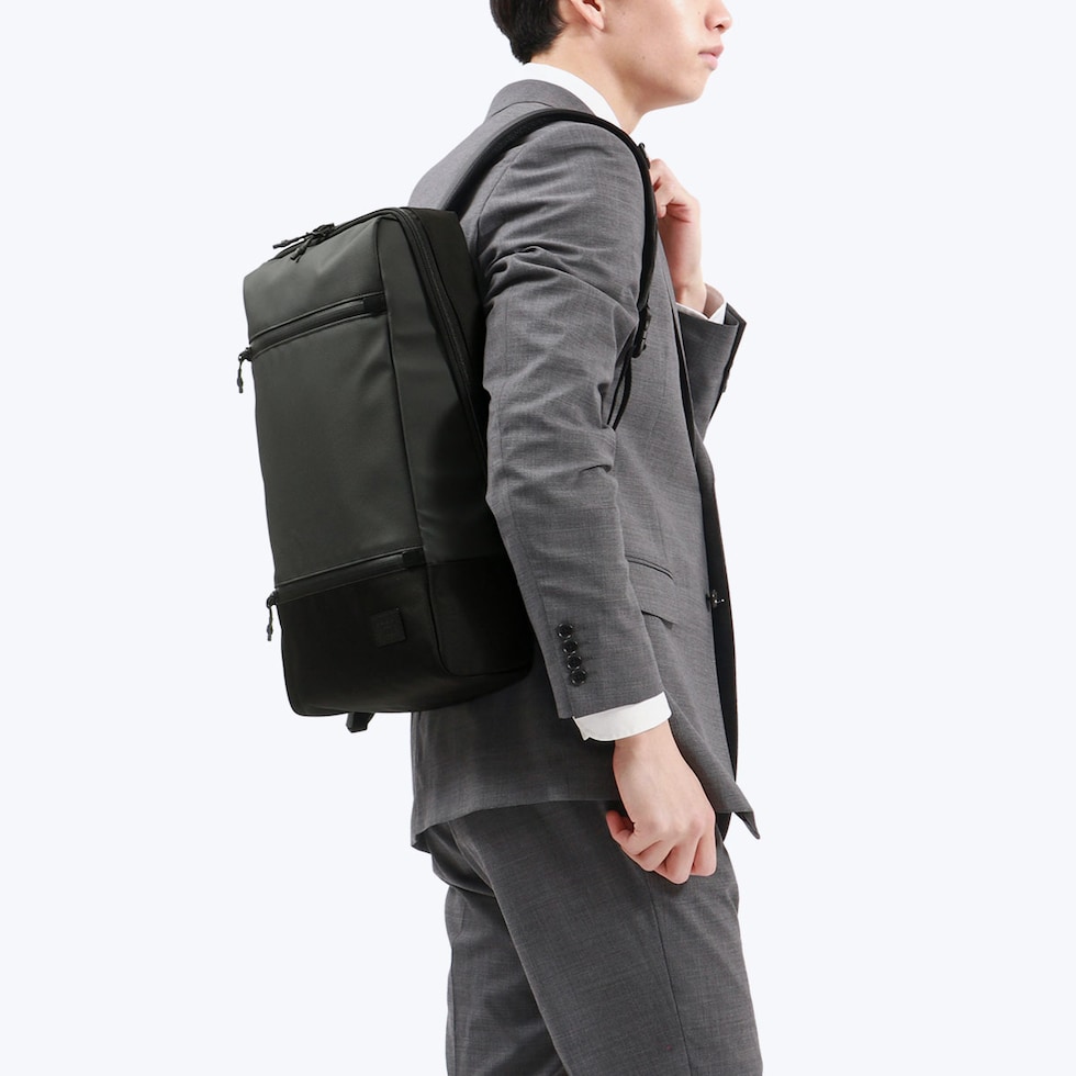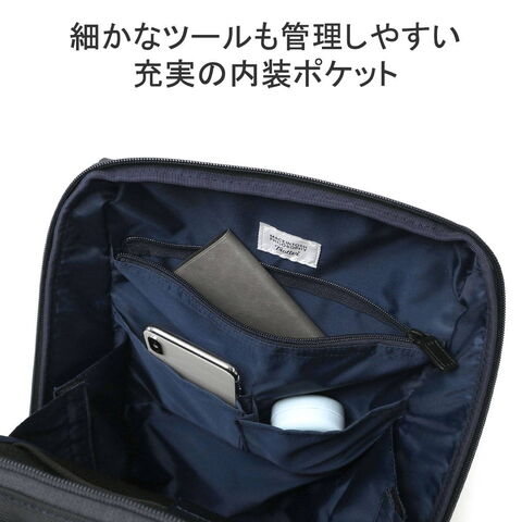 | 仕様 | <外側> ジップポケット(L)×1 └ 内蔵 ポケット(XS)×1 ジップポケット(S)×1 <内側> PC収納×1 ジップポケット(M)×1 メッシュポケット(XS)×2 ポケット(XS)×2 |