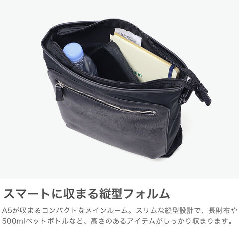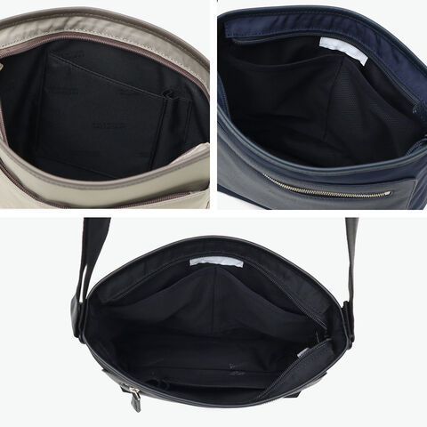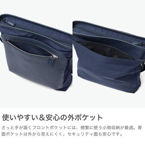 コンパクトショルダー 身の回りの必需品をスマートにまとめるコンパクトなショルダーバッグ。光沢のあるナイロンとソフトレザーのコンビで、シンプルかつ上品な印象を演出。外装・内装の多彩なポケットで、整理整頓もスムーズにこなせます。 |
