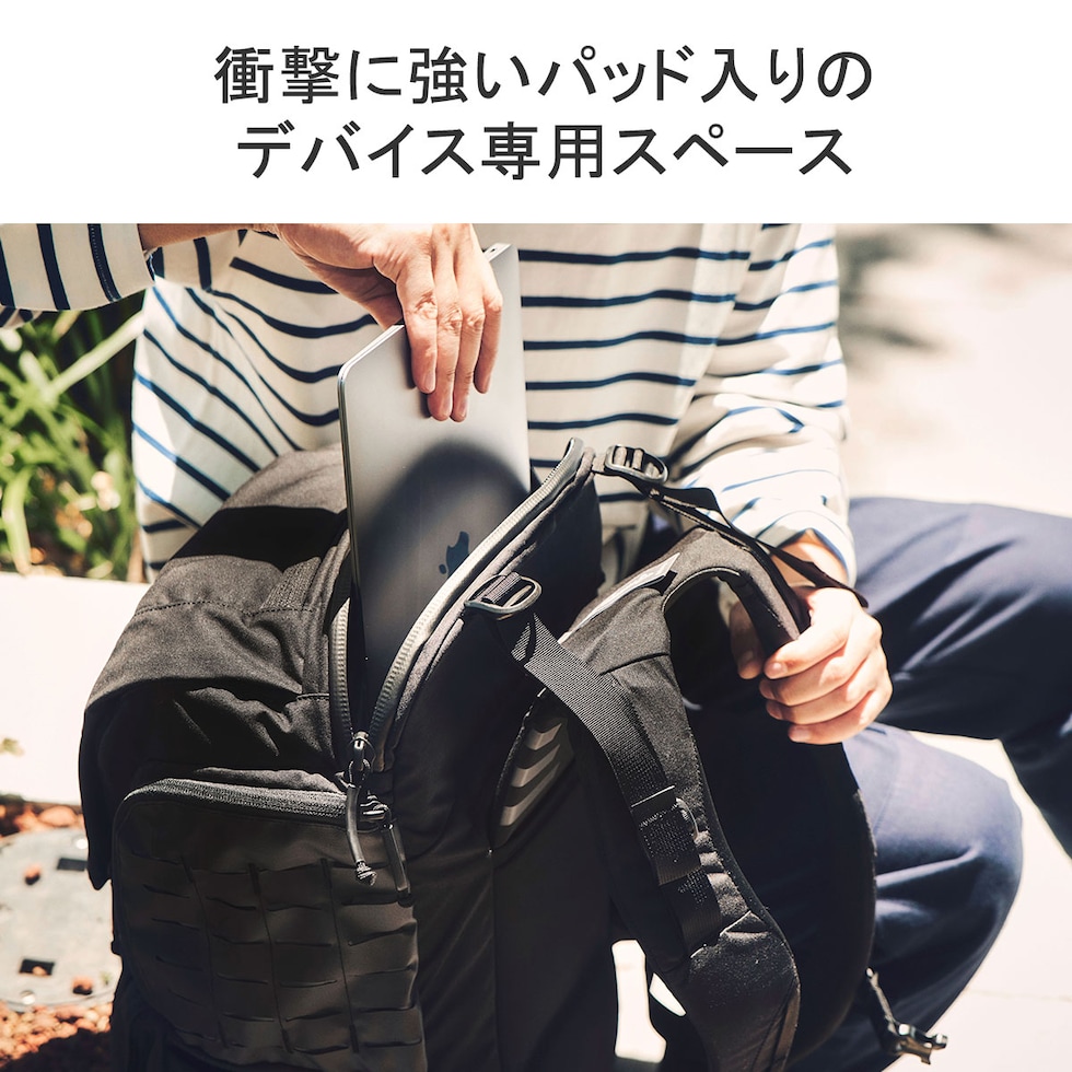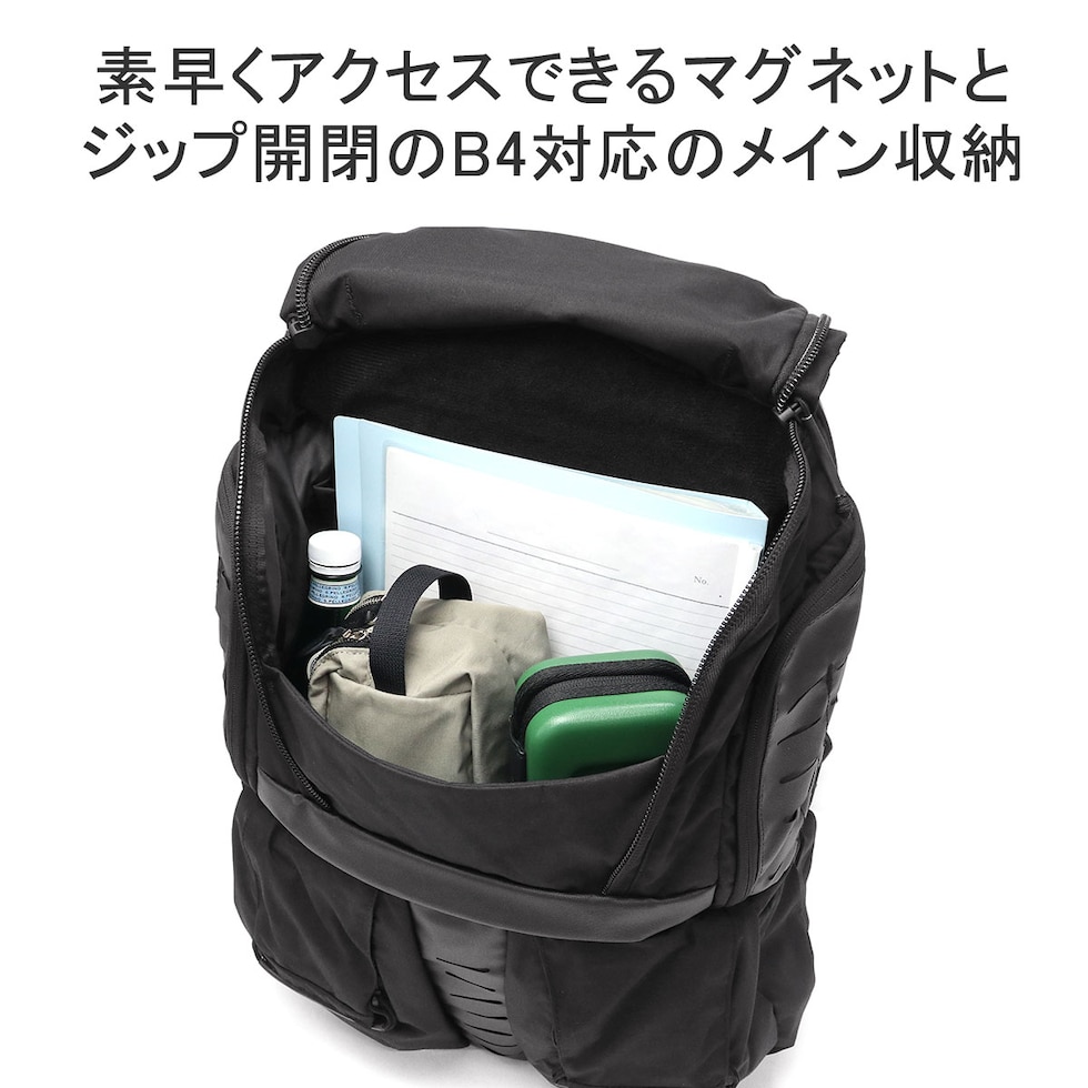 | 仕様 | <外側> ジップポケット(S)×2 └ 内蔵 ポケット(S)×各1 ジップポケット(S)×2 ポケット(S)×2 <前面収納> ポケット(M)×1 メッシュジップポケット(M)×1 <背面収納> PC収納×1 タブレット収納×1 |