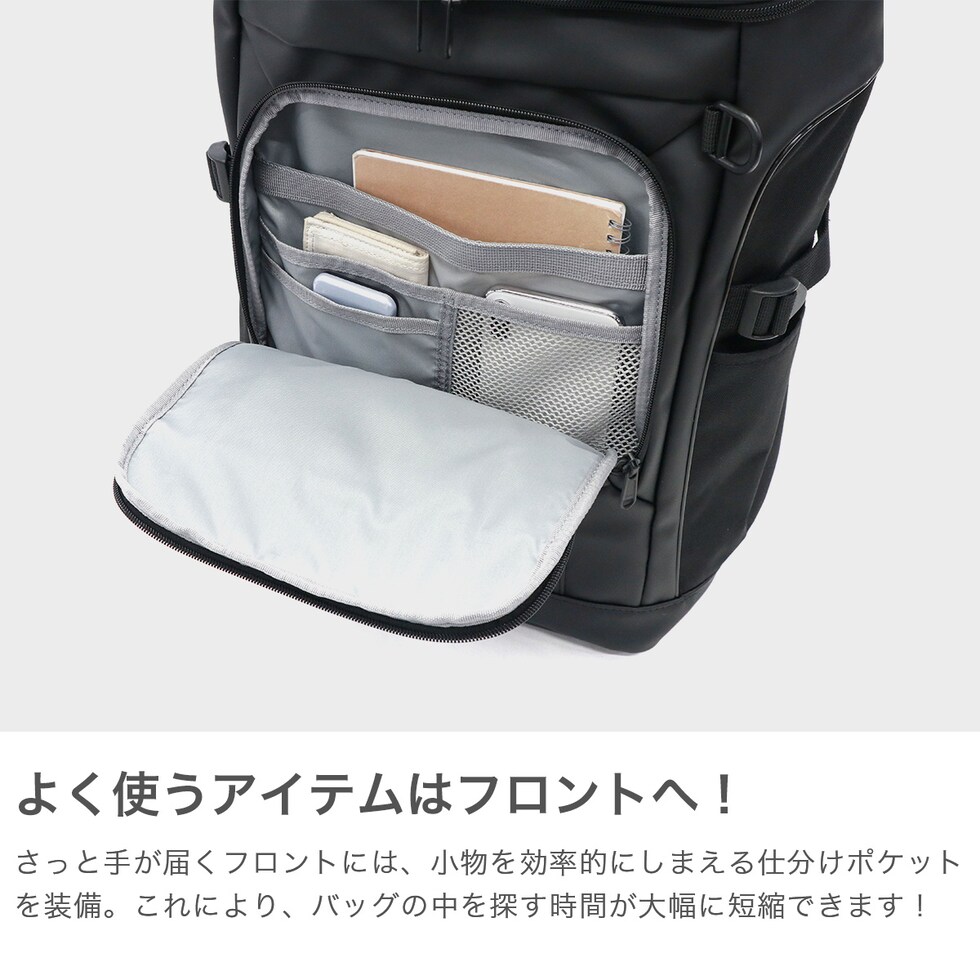 | 抜群の収納力で 便利な高機能モデル 通学や部活、レジャーシーンまでマルチに対応できるスクエアリュック。フロントに多彩なポケットを装備し、整理整頓しやすい仕様となっています。撥水素材やPCスリーブなど、高機能設計も魅力的。スポーティなデザインで、学生から大人まで幅広く支持される万能アイテムです。 |