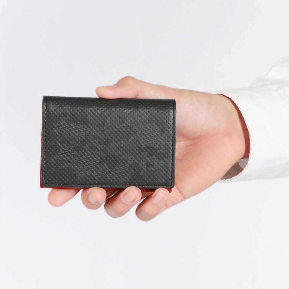 | 角度で魅せる 大人の迷彩名刺入れ 自動車のステアリングやシフトノブに採用されているハイブリッドレザーを使用した『Wickeln/ヴィッケルン』の名刺入れ。スポーティなディンプルパターンとカモフラージュ柄のエンボス加工による独創的なデザインが特徴です。内側に合わせたオイルシープスキンにより、耐久性に優れ、使い馴染みの良い仕上がりとなっています。 |