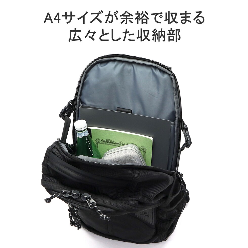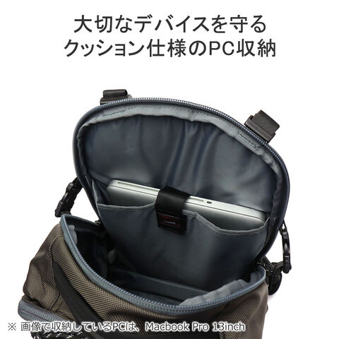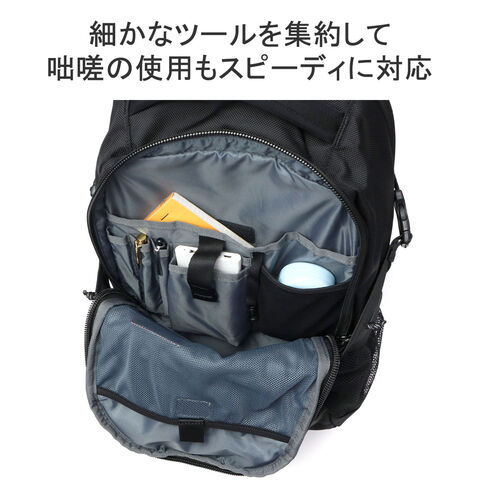 | 仕様 | <外側> ジップポケット(L)×1 └ 内蔵 ベルクロメッシュポケット(M)×1 ベルクロポケット(M)×1 ベルクロポケット(XS)×2 ポケット(XS)×1 ペンホルダー×3 キーフック×1 ジップポケット(M)×1 ジップポケット(S)×1 メッシュポケット(S)×2 <内側> PC収納×1 <付属品> チェストストラップ×1 |