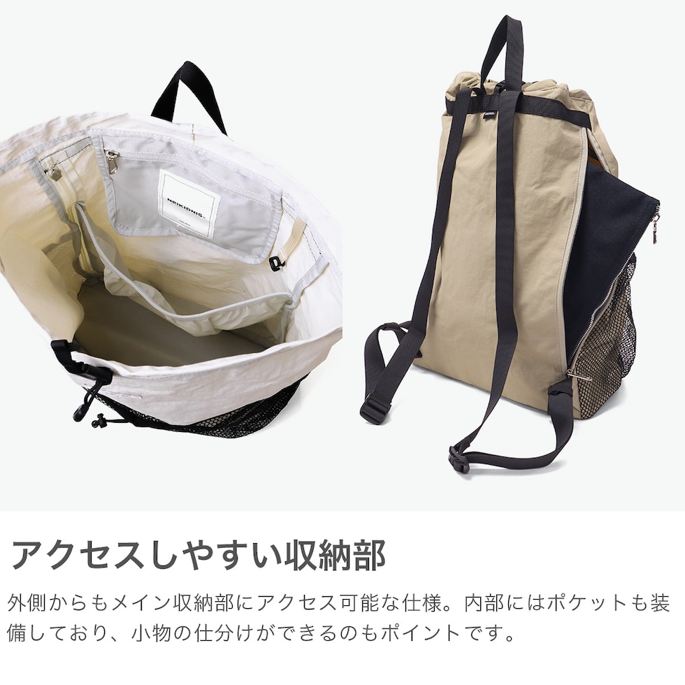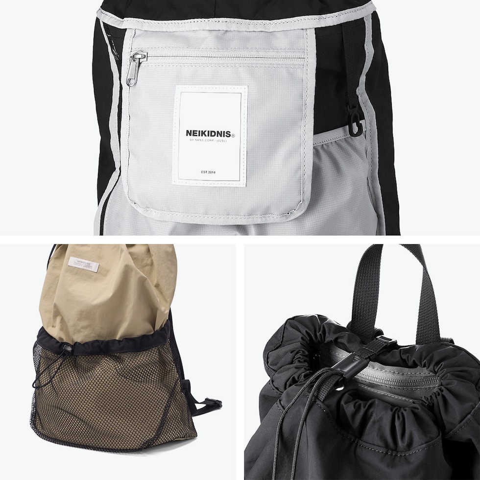 おしゃれな巾着リュック 実用性とデザインのバランスを追求する『NEIKIDNIS』のリュックサック。ざっくり収納できるラフな雰囲気が魅力です。通学からジム、アウトドアや旅行までどんなシーンでも使いやすい設計。フロントのメッシュポケットがアクセントとなり、他とは違う個性的な仕上がりとなっています。 |