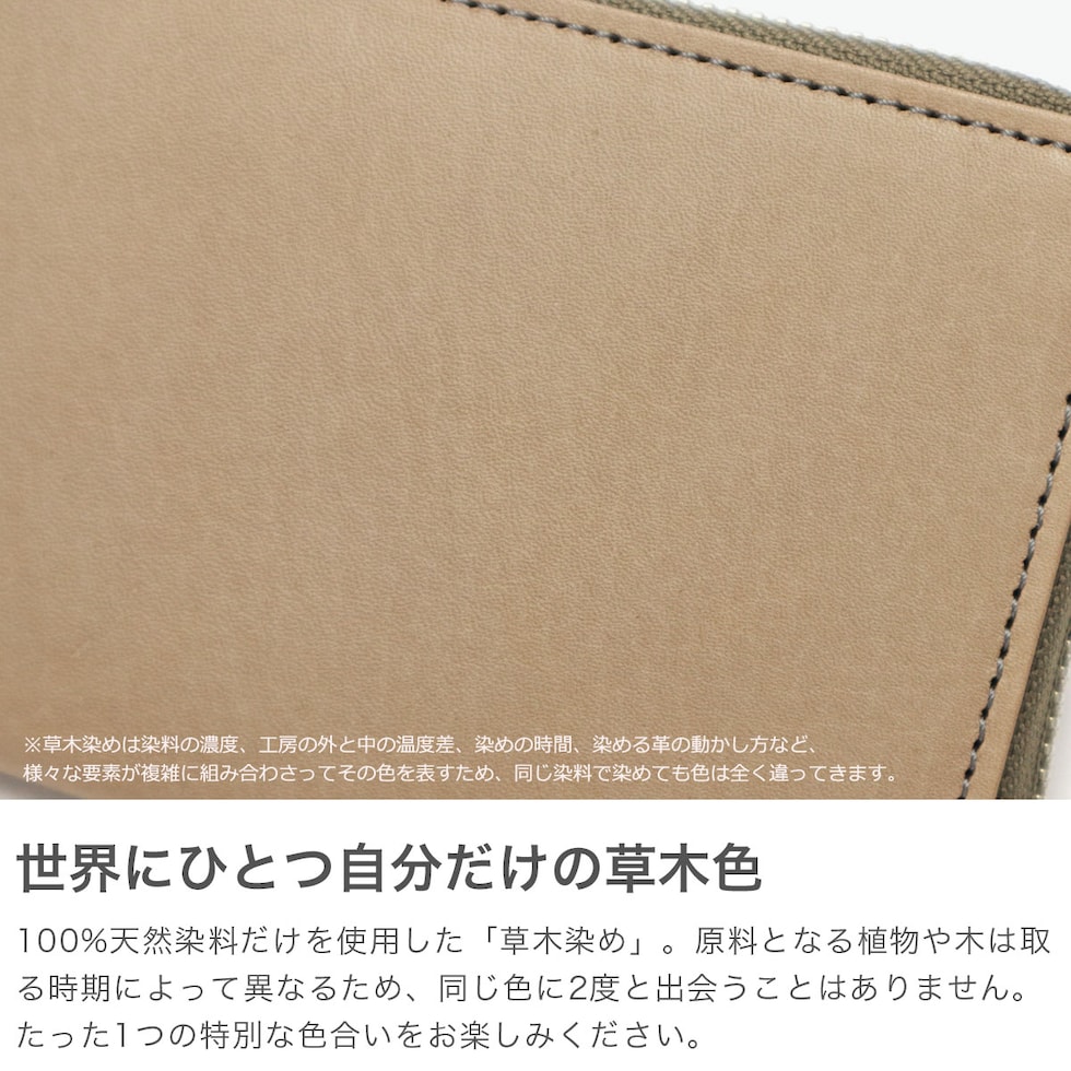 草木染めミドル財布 化学染料を混ぜる草木染めとは異なる、化学染料を使わず正真正銘100%の天然染料だけを使用した「草木染め」で革を染めた『BOTANICAL/ボタニカル』シリーズのラウンドミドル財布。草木染めの生み出す柔らかな風合いと、カラーによって染め方を変え表現された色合いをお楽しみください。また、原料となる植物や木は、取る時期によって異なり、同じ色に2度と出会うことはなく、それも草木染めの魅力の一つです。 |