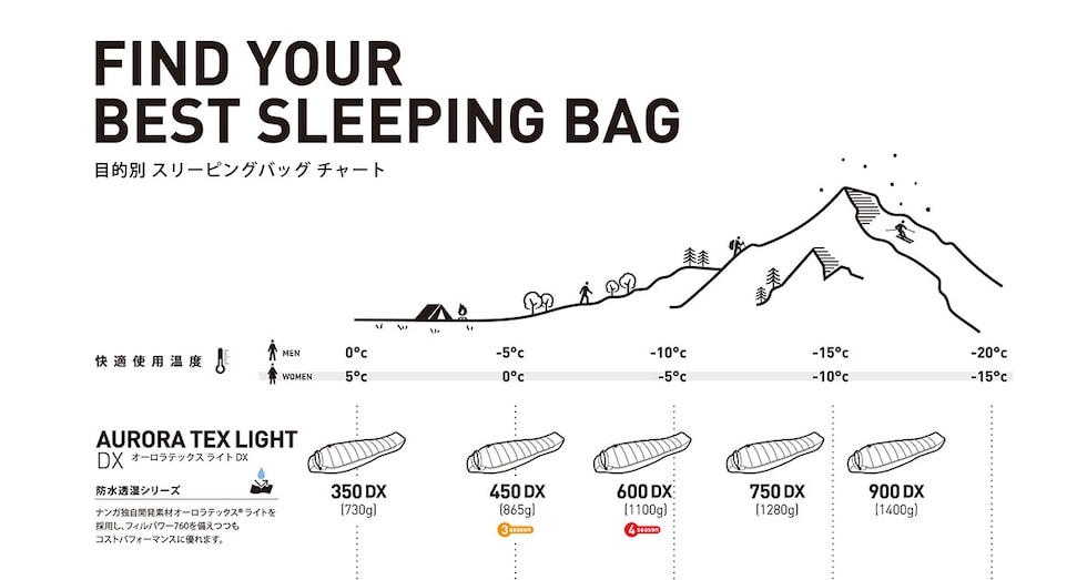 | オールシーズンで使える コンパクトな寝袋 極薄かつ軽量でありながらも、優れた耐水性を備えたスリーピングバッグシリーズ『AURORA TEX LIGHT』。こちらは春から冬まで、オールシーズンで使用可能なモデルです。高い耐水圧を持ちながらも透湿性が損なわれず、雨の日の濡れやテント内の結露を気にせず使用することが可能。内側は滑らかな肌触りのナイロン生地を採用し、防水素材によるストレスを感じない快適な寝心地をお届けします。 |