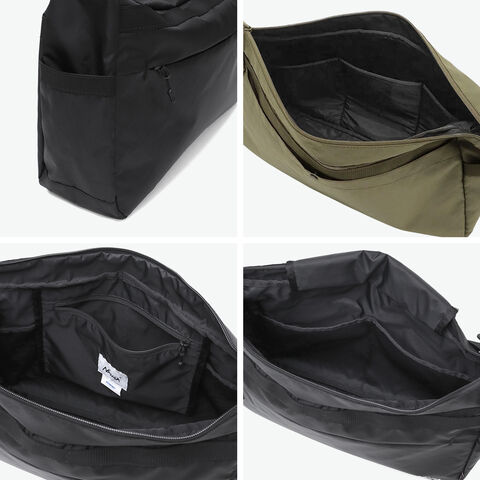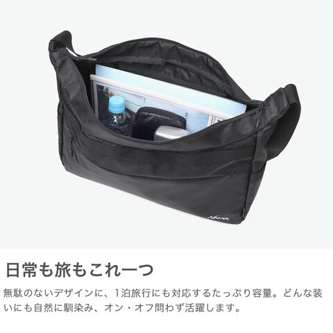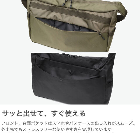 1泊程度の旅行にも対応 環境に配慮したリサイクルポリエステル素材「ECOPAK」を採用し、軽量かつ耐久性のあるショルダーバッグ。1泊程度の旅行や日常使いに最適なサイズ感で、しっかりと荷物を収納できる設計。フロントにはファスナーポケットを配置し、スマホや財布などの小物をサッと取り出せる使い勝手の良さが魅力です。さらに、内側には耐久性の高いネオプレーン素材のポケットを搭載し、大切な荷物をしっかり保護します。 |