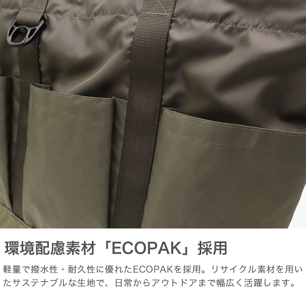 1泊程度の旅行もカバー 軽量かつ撥水・耐久性にも優れた、ECOPAKシリーズのトートバックです。1泊程度の旅行やキャンプにも使える大容量サイズ。肩掛けに便利なショルダーストラップ付きで、荷物が多い日や旅行先でも使いやすい仕様になっています。容量・軽さ・耐久性を兼ね備え、通勤や買い物といった日常使いはもちろん、アウトドアや旅行バッグとしても頼れるアイテムです。 |