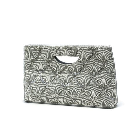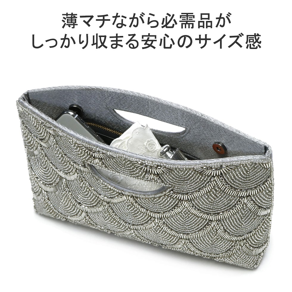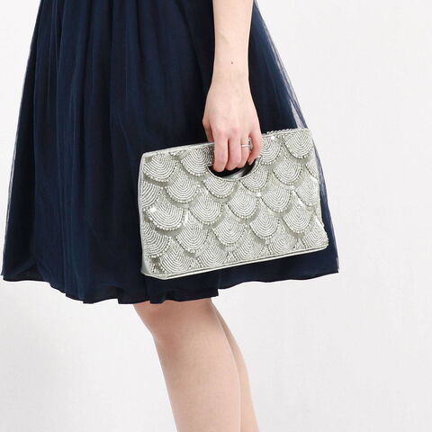 | 特別なシーンを より一層華やかに 甘さを抑えたスカラップ模様のビーズ刺繍が華やかなクラッチバッグ。財布はもちろんスマートフォン、袱紗(ふくさ)などの必需品が入るサイズ感です。取り外しが可能なショルダーチェーンが付属しており肩掛けも可能。落ち着いたワントーンでまとめられており、ドレスアップスタイルへの合わせやすさも魅力です。 |