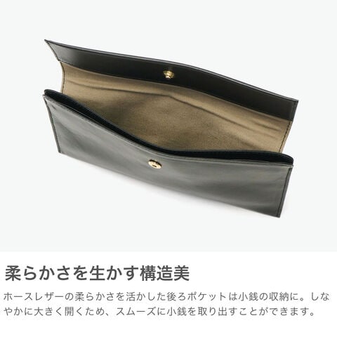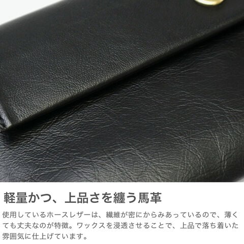 | 柔らかな手触りと 上品で落ち着いた雰囲気 柔らかなホースレザーを使用した『ハスキー』シリーズの長財布。かぶせを開けるだけでお札、カード、小銭をワンアクションで取り出すことができます。使用しているホースレザーは、繊維が密にからみあっているので、薄くても丈夫な素材。ワックスを浸透させ仕上げることで、上品な落ち着いた雰囲気となっています。 |