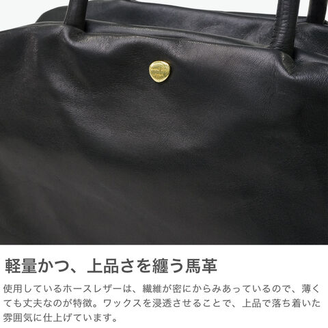 大人の馬革トート 柔らかなホースレザーを使用した『ハスキー』シリーズのコンパクトトートバッグ。A5サイズ対応で、必要な荷物をすっきり収納できます。ファスナー付きで安心感があり、手持ちとショルダーの2WAY仕様。無地で上品なデザインは、旅行や日常のお出かけ、きれいめスタイルにも自然に馴染みます。大人の女性に似合う、シンプルで洗練されたアイテムです。 |