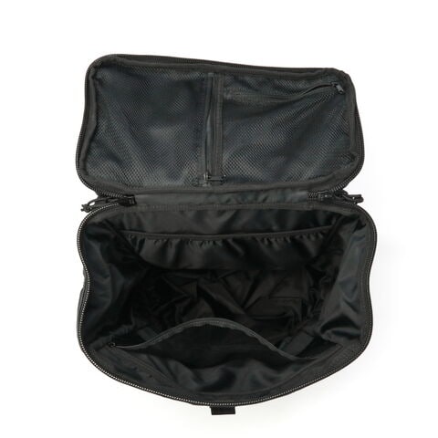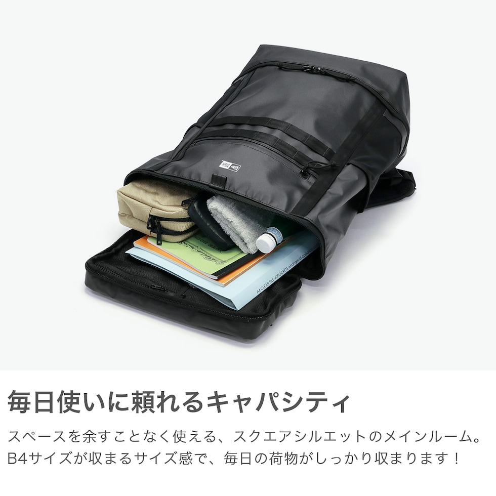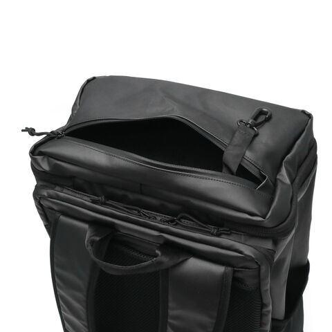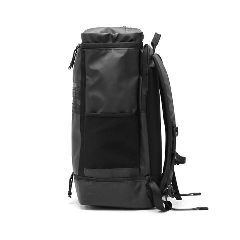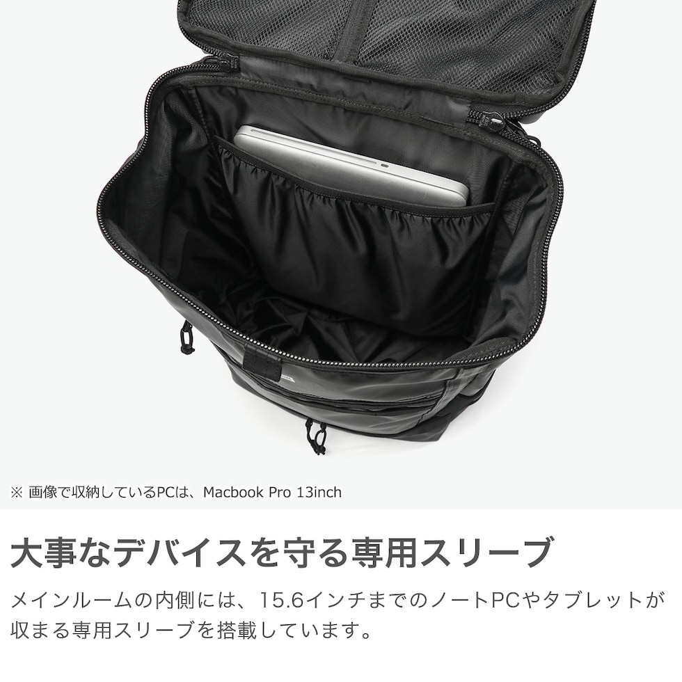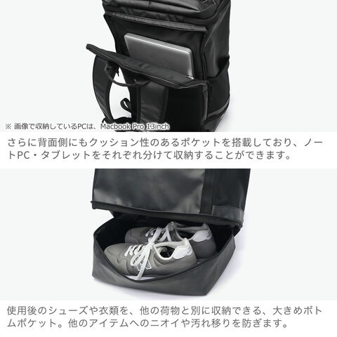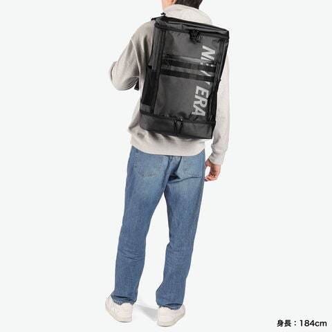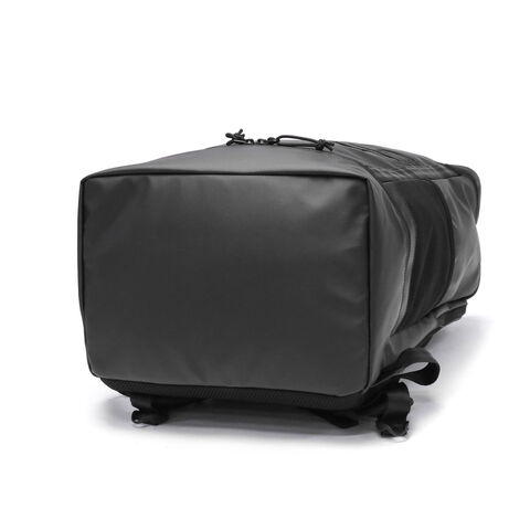 2種類のPC収納を完備 ボックスシルエットが特徴的な大容量バックパック。BoxPackの中では最大サイズの46L容量モデルです。本体素材には、光沢感と耐候性が特徴のTPU加工を施しています。また内外各1箇所ずつに、PCポケットを装備。PCやタブレットなど、持ち運ぶデバイスが多い人にオススメです。 |