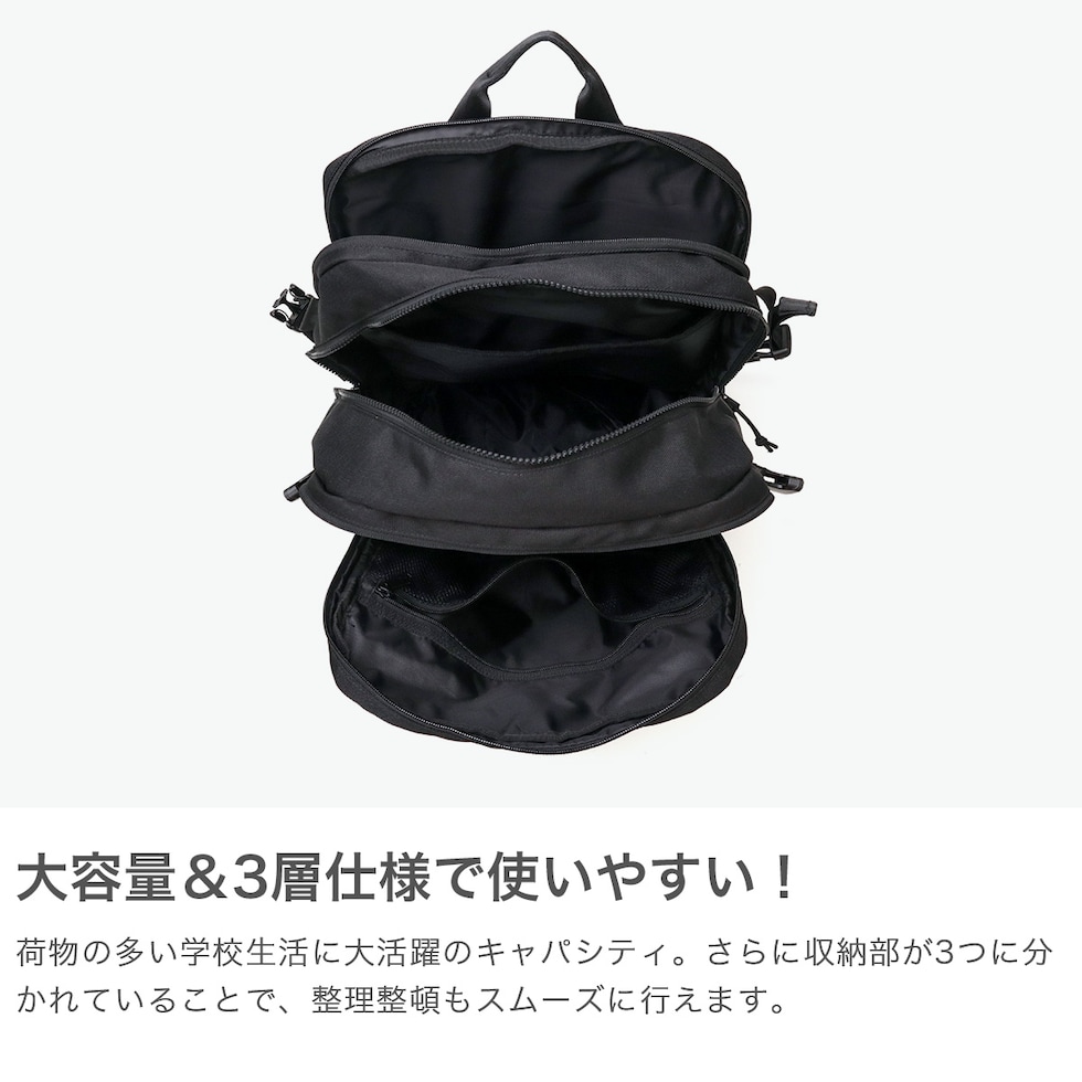 通学や通勤、スポーツシーンに活躍する大容量リュック。A3サイズ対応の3層構造で荷物をすっきり整理可能です。外付けネットカバーにはボールを収納でき、サイドポケットには500mlのペットボトルを収納できます。機能性とデザイン性を兼ね備えた、使い勝手の良い万能モデルです。
