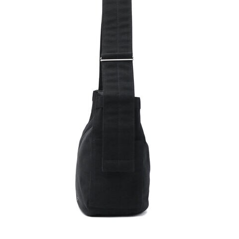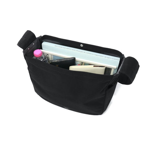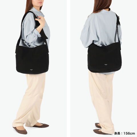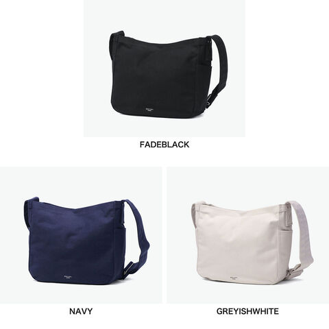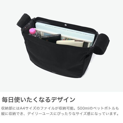| 心地よい手触りと 頼れる収納力 マチ付きで収納力も備えたシンプルなショルダーバッグ。コットン×アクリルのツイル生地は裏面のみPVC加工を施し、やさしい手触りとハリのある質感を両立しています。太めのショルダーストラップで肩への負担も少なく安定感抜群。軽量で耐久性にも優れ、デイリーに活躍するアイテムです。 |