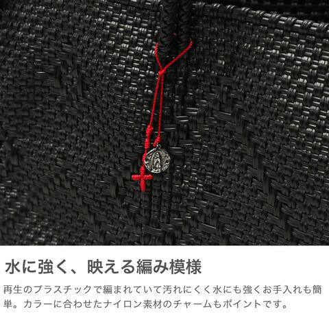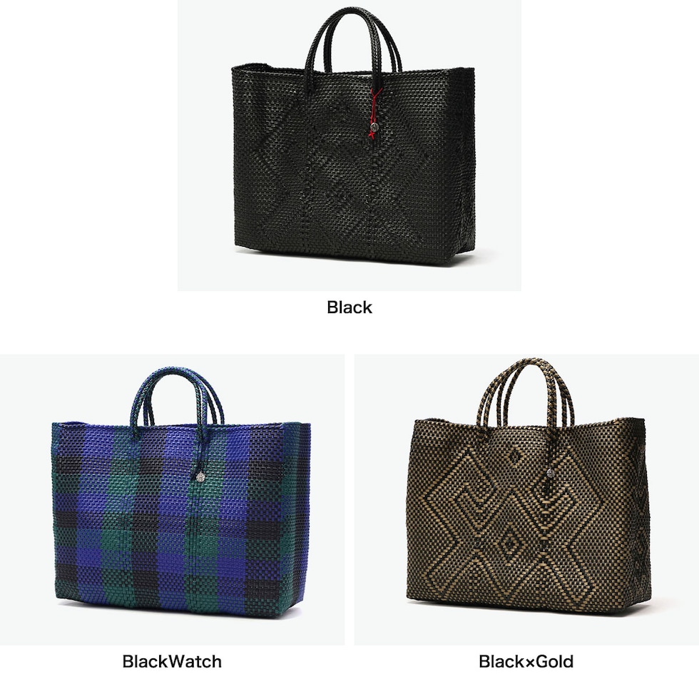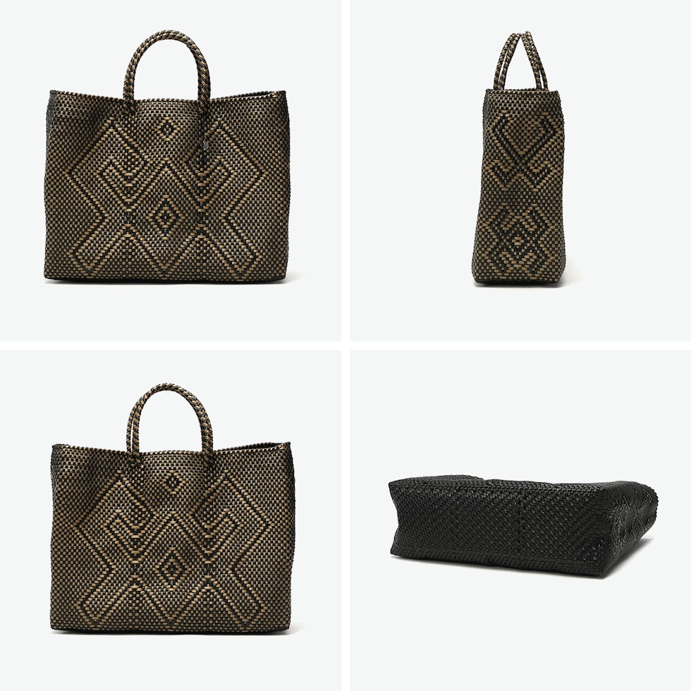 ヒストリカルな紋様 メキシコ・オアハカ州で手編みされた、ラージサイズのカゴトートです。ヒストリカルな紋様を描くデザインはメキシコの渇いた大地を想起させ、いつものスタイルにほどよいアクセントをプラス。また水や汚れに強い再生素材により、実用性も抜群です。 |