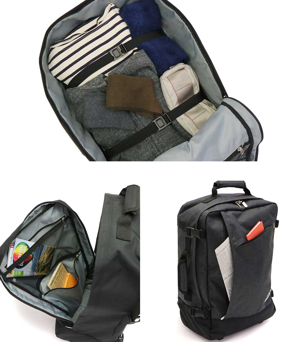 容量が35L収まるメインルームは、1~2泊程度の旅行にぴったりです。内装には視認性の良いグレーの生地を採用し、収納固定用のベルトがついているので荷崩れしにくくなっています。内装・外装共にポケットが充実した、荷物の仕分けに便利な設計です。