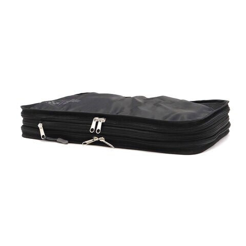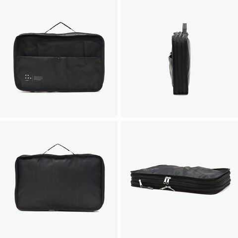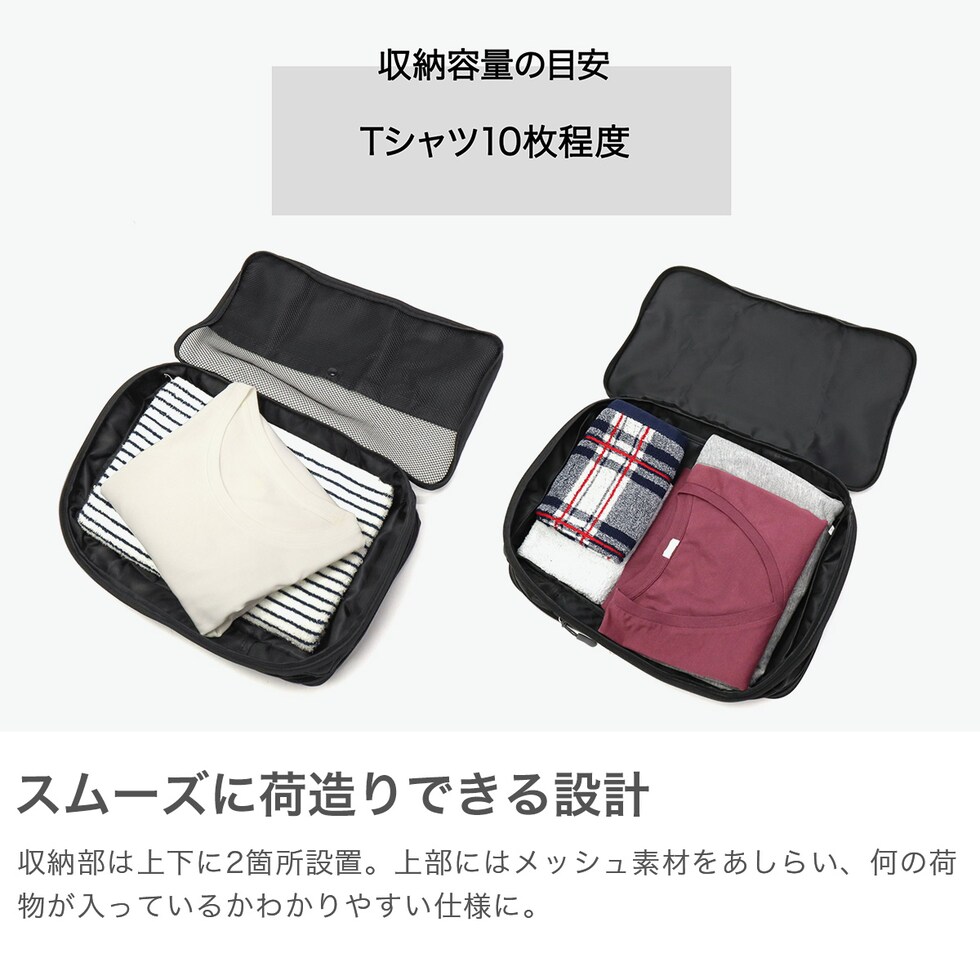 折りたたみで旅行楽々 ファスナーを閉めるだけで、荷物がぎゅっとコンパクトになる圧縮ポーチです。使わない時は内側のポケットに折りたためるパッカブル仕様。外側にはボタンポケットが付いており、ハンカチや靴下などの細かいものも分けて収納することができます。 |