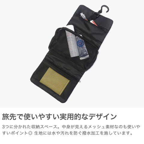 | 壁にかけたまま使える Sサイズトラベルポーチ 洗面所や壁に吊り下げたまま使える多機能な大容量ポーチ。サイズは、1人用のスキンケア用品などをまとめて収納できるSサイズです。真ん中のポーチは取り外して使うことも可能!撥水加工で汚れにくく、使いやすさにもこだわりました。 |
