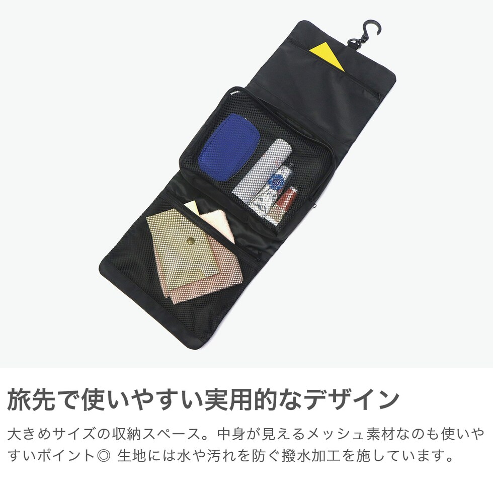 | 壁にかけたまま使える Lサイズトラベルポーチ 洗面所や壁に吊り下げたまま使える多機能な大容量ポーチ。サイズは、家族全員の洗面用具やメイク道具などをまとめて収納できるLサイズです。真ん中のポーチは取り外して使うことも可能!撥水加工で汚れにくく、使いやすさにもこだわりました。 |